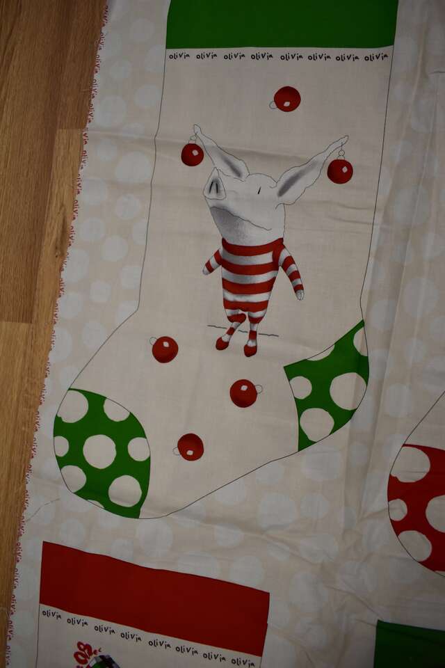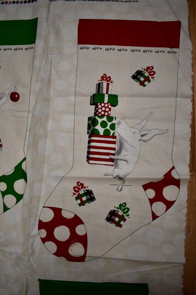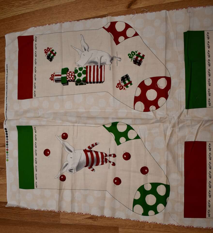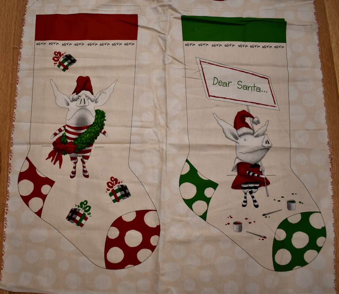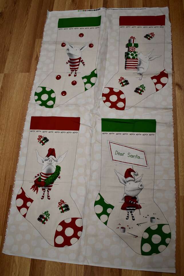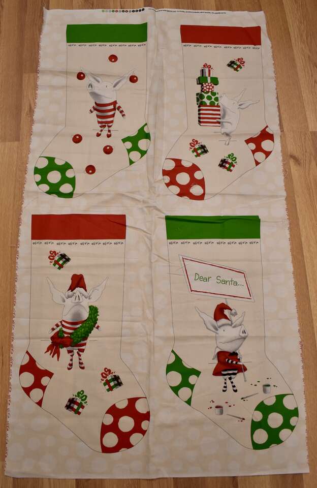 IT MEASURES… The Panel Itself Measures… 23 1/2 inches Wide X 45 Inches Long and makes two really cute Christmas Stockings.