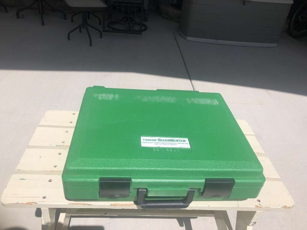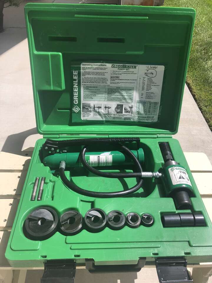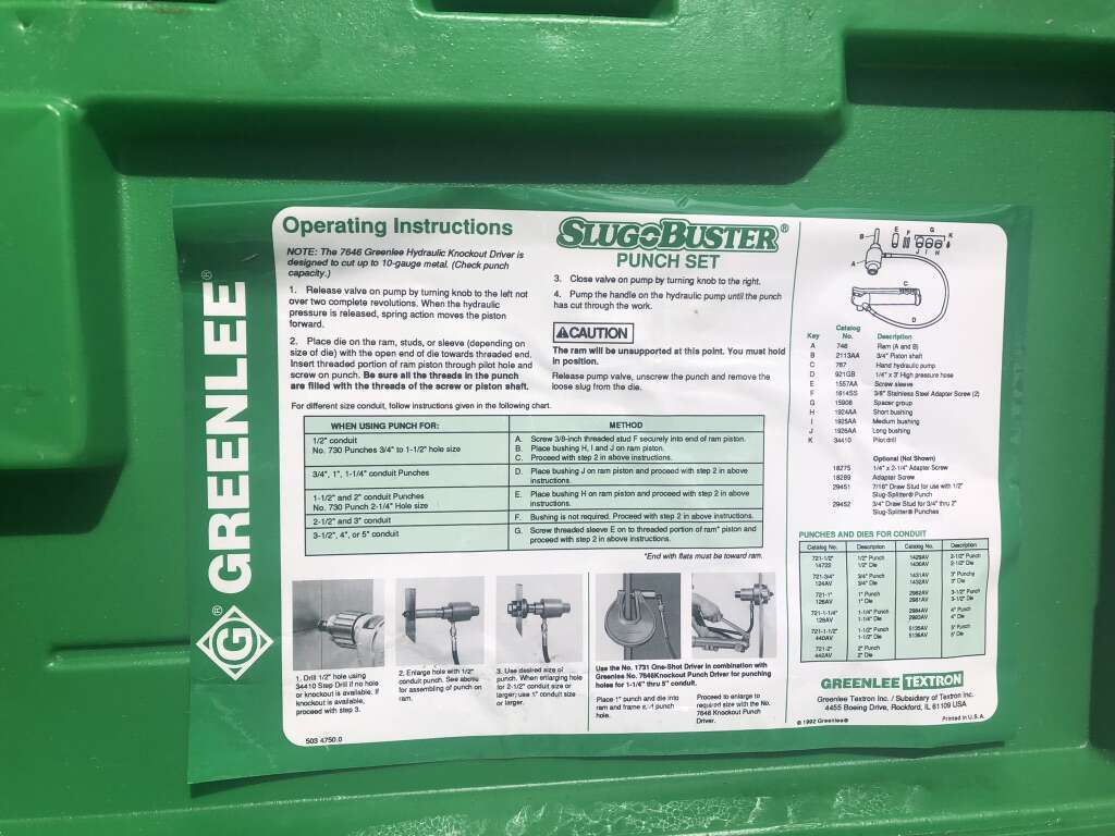 Model 7306SB like new. Greenlee 7306SB Includes: • Driver • Hand pump • Slug-Buster punches • Dies and draw studs for 1/2 through 2 conduit • Adapter • Spacers • Kwik-Stepper Step Bit • Plastic case • 1 each of the following: 721-1/2, 14722, 721-3/4, 124AV, 721-1, 126AV, 721-1-1/4, 128AV, 721-1-1/2, 440AV, 721-2, 442AV, 746, 2113AA, 1557AA, 1924AA, 1925AA, 1926AA, 34410, 767, 06302, 30206 • 2 each of the following: 1614SS Greenlee 7306SB Features: • Fast, easy and simple to operate. • Compact design for field use on construction sites and maintenance jobs. • Punches 10 times faster than wrench method. • Will also drive 751 Cable Cutter head. • Can be used with most standard round, Slug-Buster and Slug-Splitter punches (not 1/2, 9/16, 5/8). • Can be used with non-round punches (adapter may be required). • 3-foot hose. • Powerful 11-ton hydraulic ram.