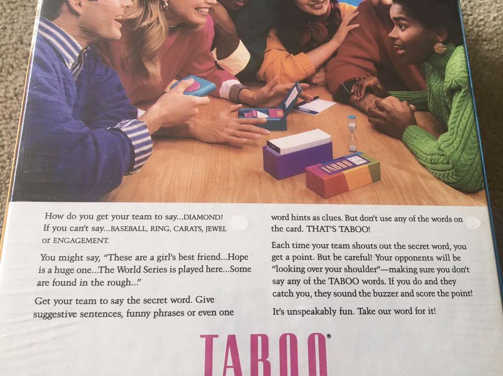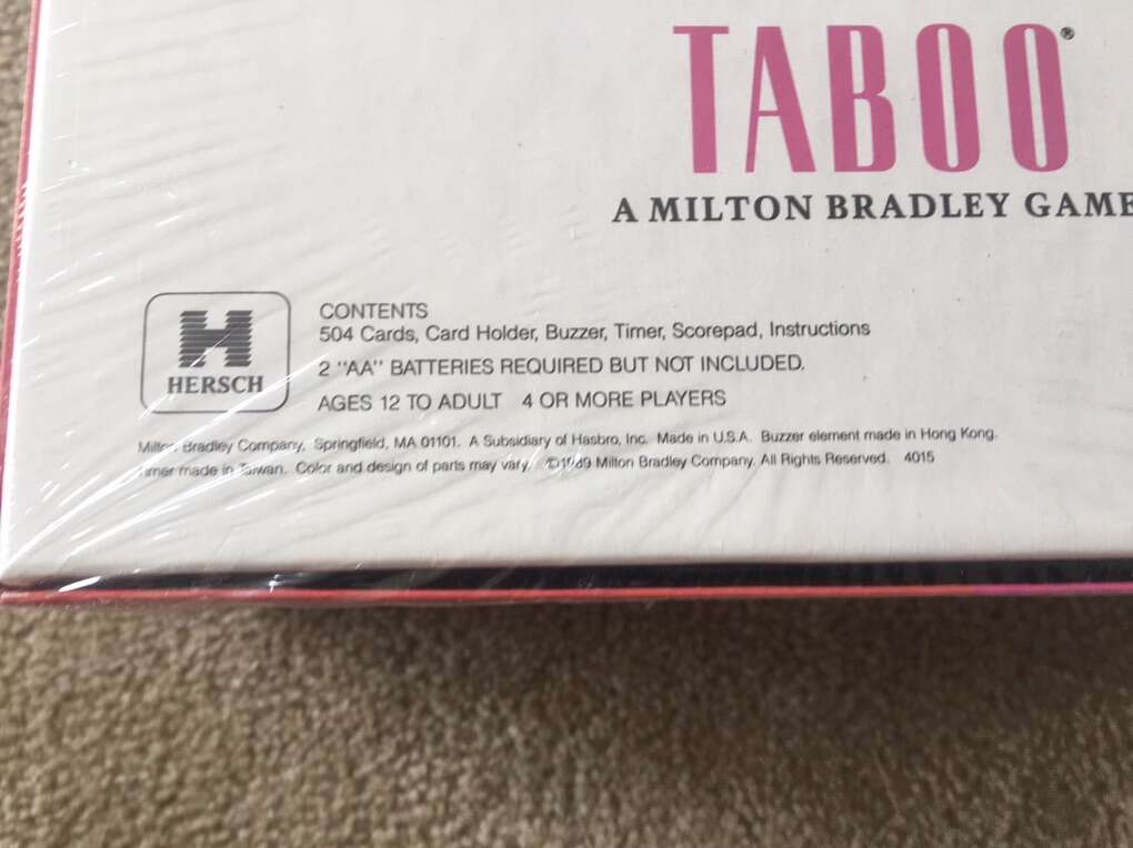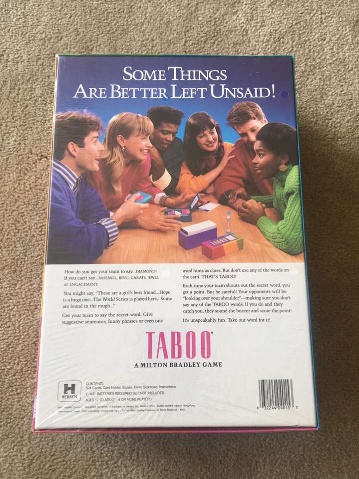 NEW (sealed in plastic) Vintage 1989 Taboo Game. The game of unspeakable fun! By Milton Bradley. Ages 12+, 4 or more players. New, unopened condition. Text only. Cash or Venmo.