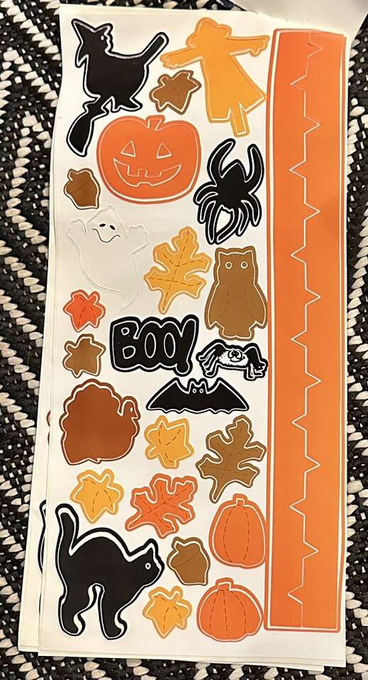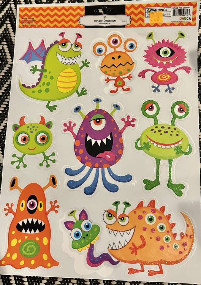This is a wonderful group of stickers and window clings, many of which I have used on my mirrors and walls. 1 Jack-o-lantern cling, 2 sheets of Fall and Halloween stickers, a sheet of evil eyes clings, a sheet of adorable monster clings, and a large set of Make Your Own Monster stickers. We had a very colorful monster room that these items played an important role. We have enjoyed them and now it’s your chance.