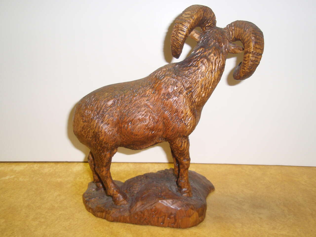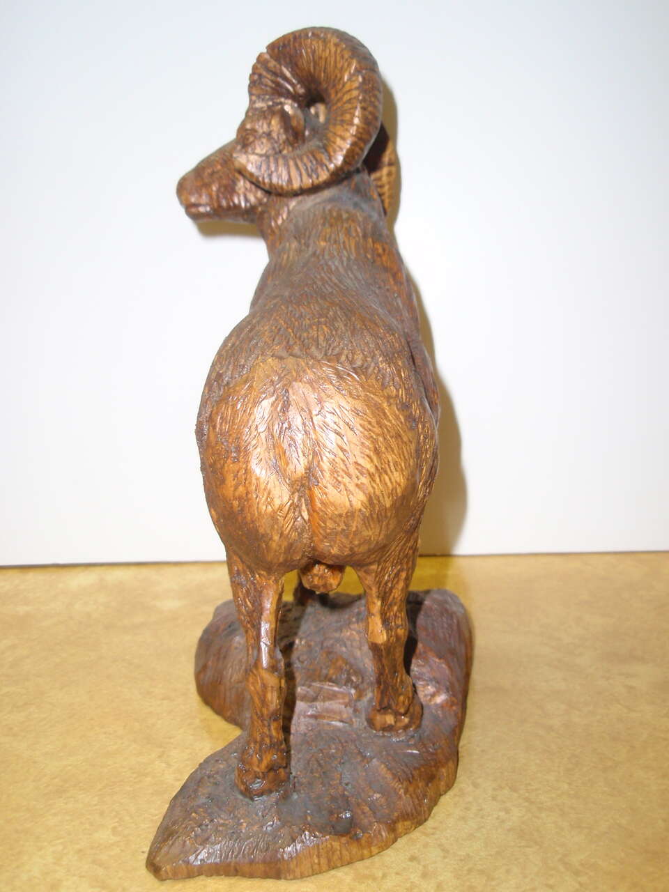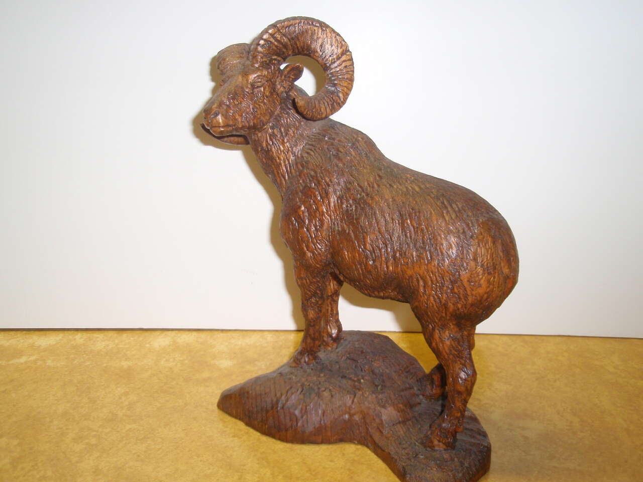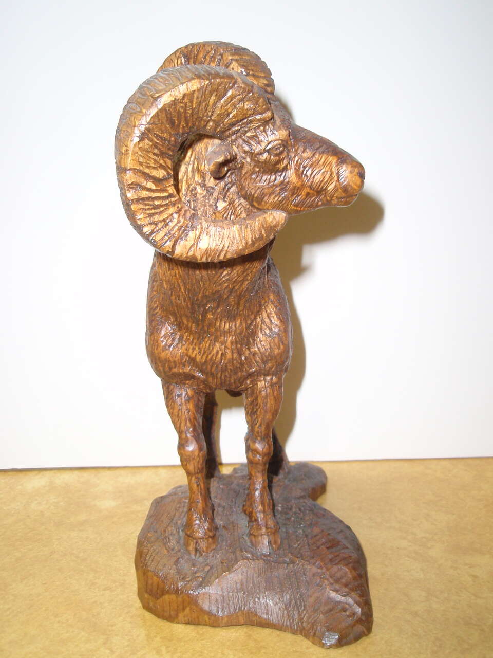 Rocky Mountain bighorn ram wood carving. 1 of a kind. Detailed realistic carving.