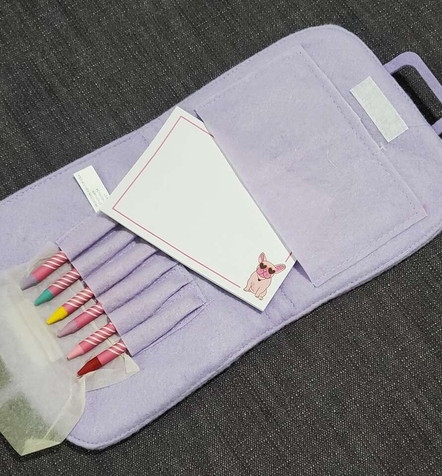 Crayons and coloring pad in a cute felt travel bag