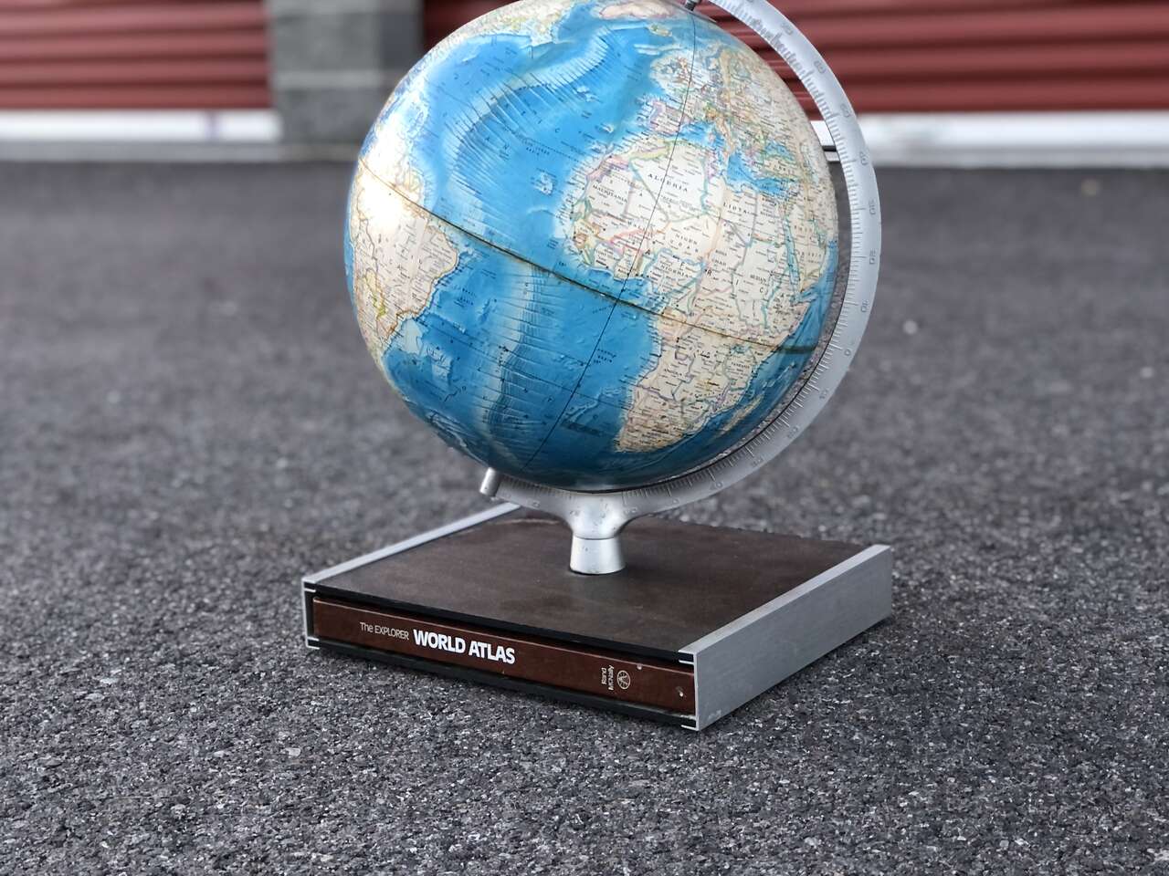 Desk globe with rectangular wood base and world atlas is $60