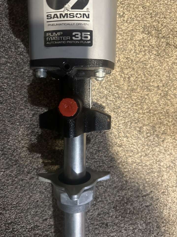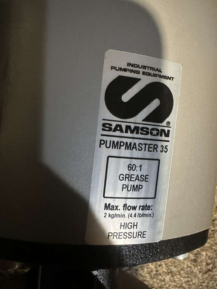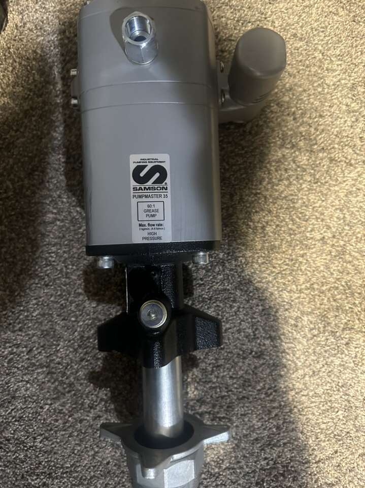 I have a new Samson 530611 Grease Pump for 400 lb. (55 Gal) Drum, 60:1 Pumping Ratio, 8700 Max PSI. Heavy Duty double acting pump that combines high pressure and volume delivery. Recommended for use in distribution and greaseing systems that include pipe lines, hose reels, etc. Pump includes height 2″ NPTM adjustable bung adaptor for tank or drum bung mounting Pump Pressure Ratio: 60:1 Continuous Duty Flow Rate: 1.1 lb/min (500kg/min) Max Free Flow Rate: 4.4lb/min (2 kg/min) Air Pressure Operating Range: 20-145 PSI (1.5-10 bar) Maximum Outlet Pressure: 8700 PSI (600 bar) Air Motor Effective Diameter: 3 15/100 (80 mm) Air Motor Stroke: 3 15/100 (80 mm) Air Consumption: 15.9 scfm (450 NL/min) Air Inlet: 3/8 NPTF Fluid Outlet: 3/4 NPTF Wetted Materials: Cast Iron, Hard Chromed Steel, Steel, UHMWPE, NBR, PTFE, Viton Noise Level: 80 dB Max Line Length: 250' (75 m) Pump Description: Heavy Duty High Pressure
