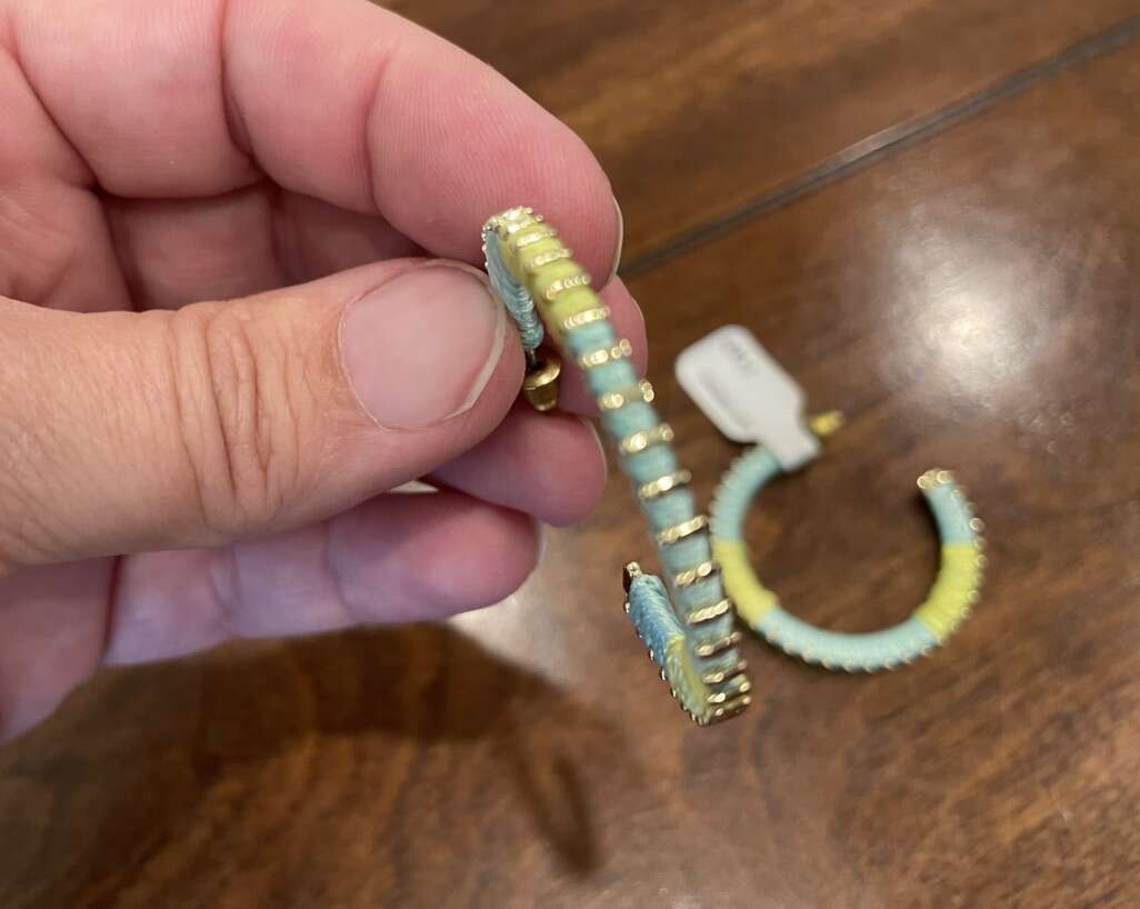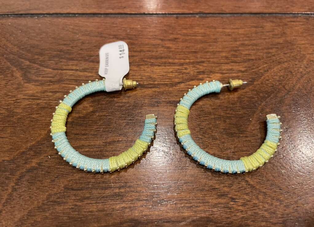 I have a pair of new hoop earrings. They are gold tone with yellow and light blue string wrapped around them so the gold shows through. I’m not sure what the metal is. They are just over 1 1/2 inches across. The price tag shows they were $14. I’m asking just $3. See my other ads for jewelry, artwork, home decor and more.
