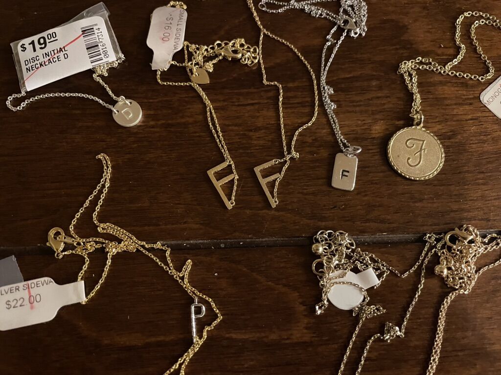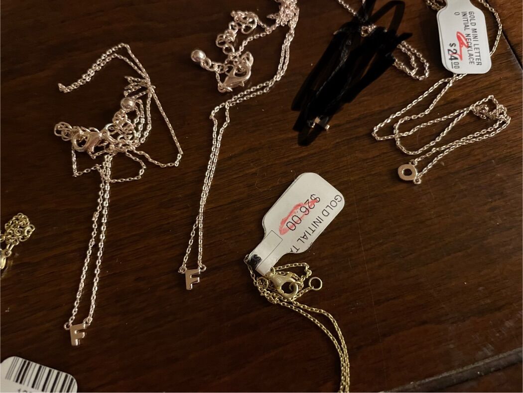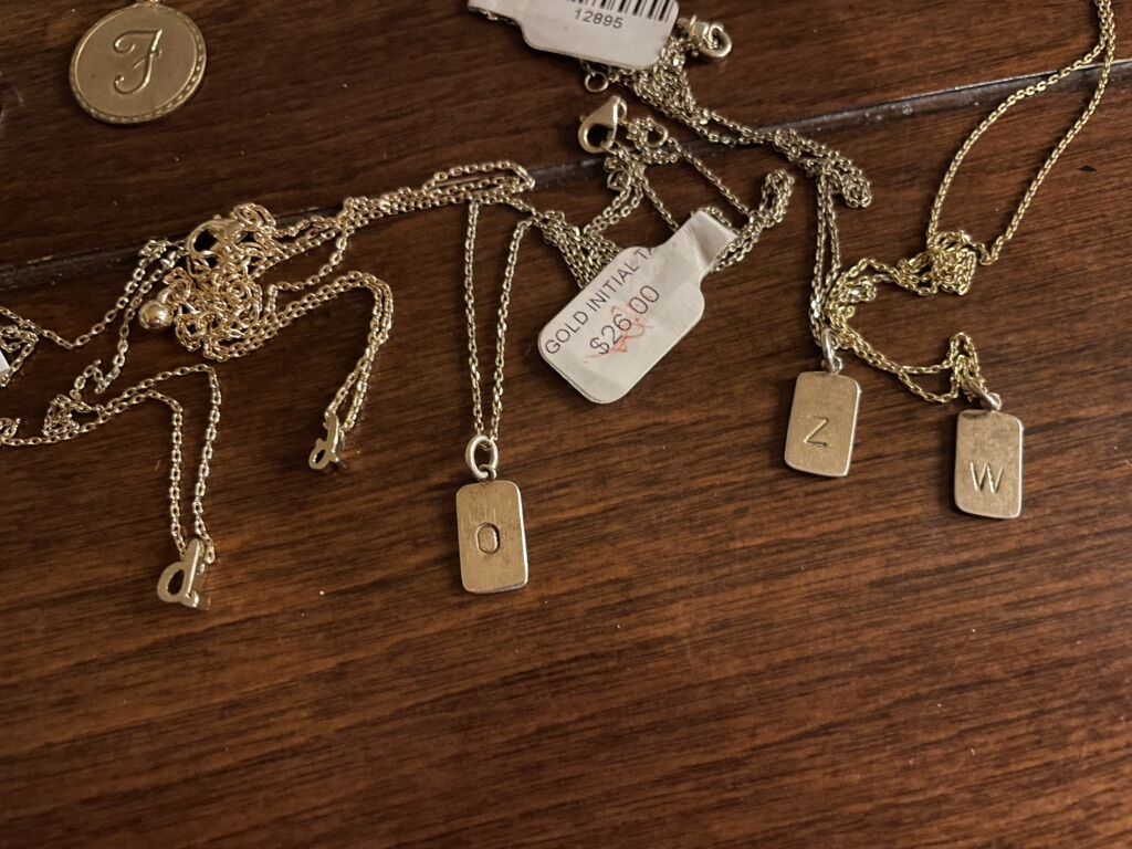 I have several different new necklaces with initials. They are different styles and letters. I have a silver disc with a D, 2 gold lowercase script Ds, 2 gold Fs that are a little bigger than the rest, a silver rectangle with an F on it, a gold script F on a round medallion, 2 tiny rose gold Fs, a tiny rose gold O, a silver P on a gold chain, a silver rectangle with an O on it, a silver rectangle with a Z on it, a silver rectangle with a W on it. The price tags range from $16-$26. I’m asking just $3 for each. See my other ads for jewelry, artwork, home decor and more.