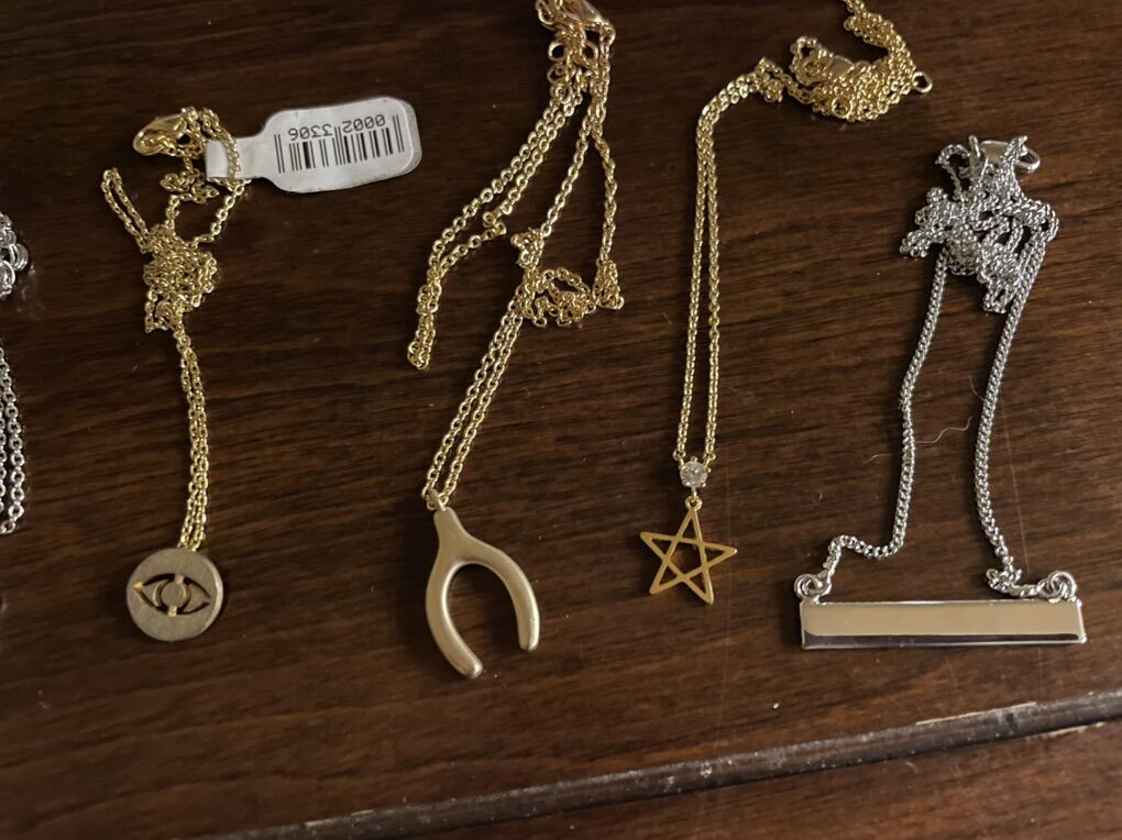 I have 6 new necklaces with small charms. There’s a brushed gold one with a koala bear, a silver one with a matte silver paw, a brushed gold circle with an eye cut out, a gold wishbone, a little clear stone over a gold star and a silver rectangle bar. The price tags show they were all $18. I’m asking $3 each. See my other ads for jewelry, artwork, home decor and more.