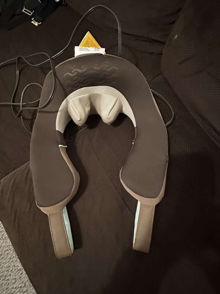 New neck massager. Parents never used this one and I have one. Neck Massager with Heat Integrated Onand Off Button, Deep-Kneading Massage, Comfort Flex Handles Control Intensity for Sore Muscles, Soft Foam, Easy to Use, it is Brown.