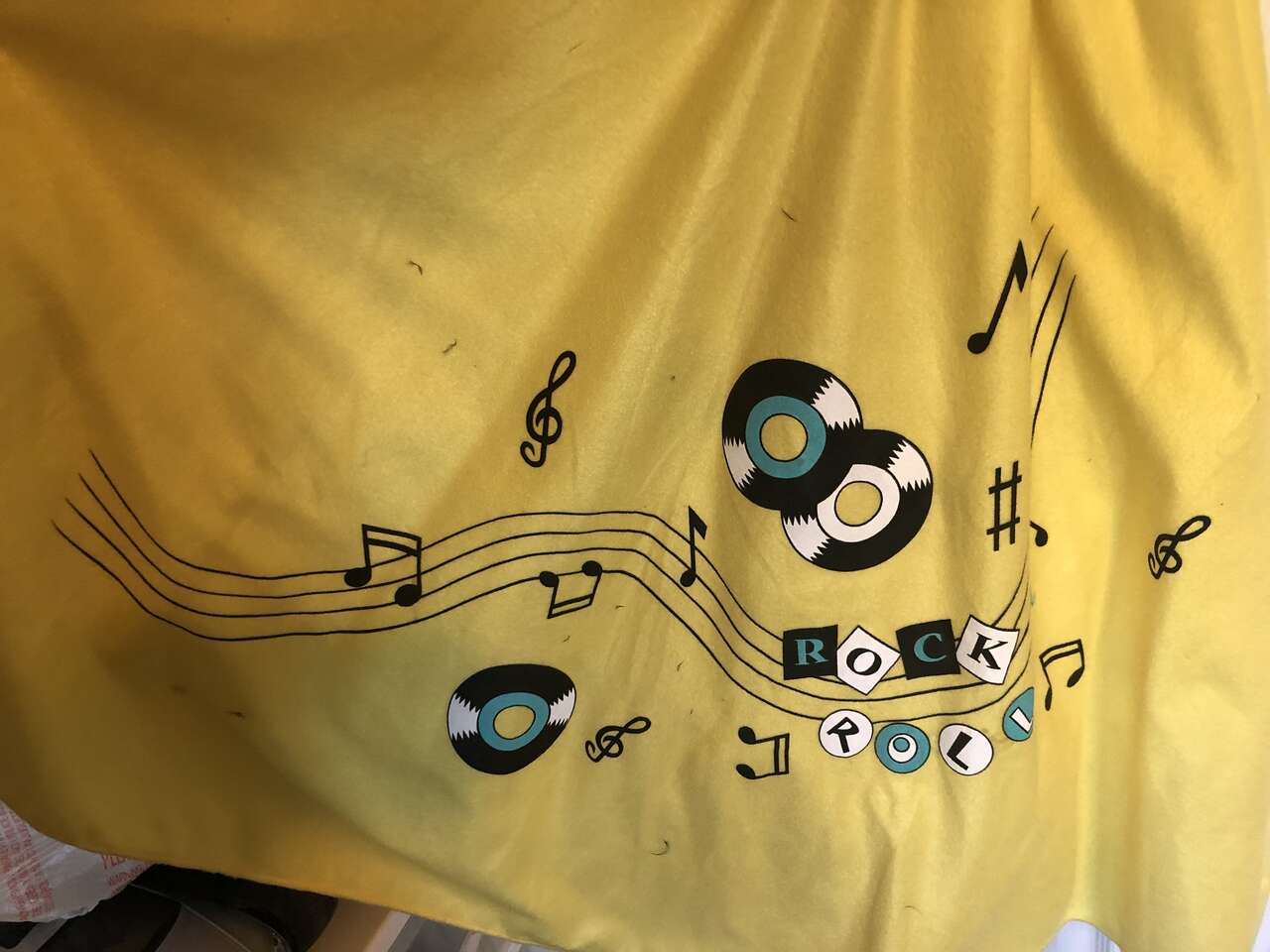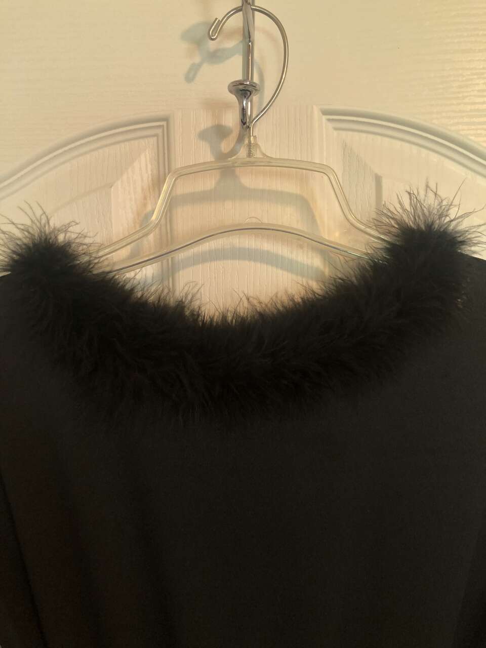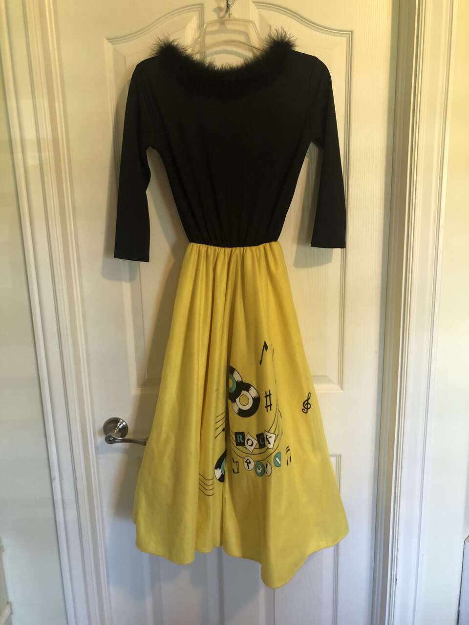 Black and Yellow Rock & Roll Dress w/ a black feather neckline. $40.00 Skirt Length: 29 Dress Length: 45 Shoulders: 16