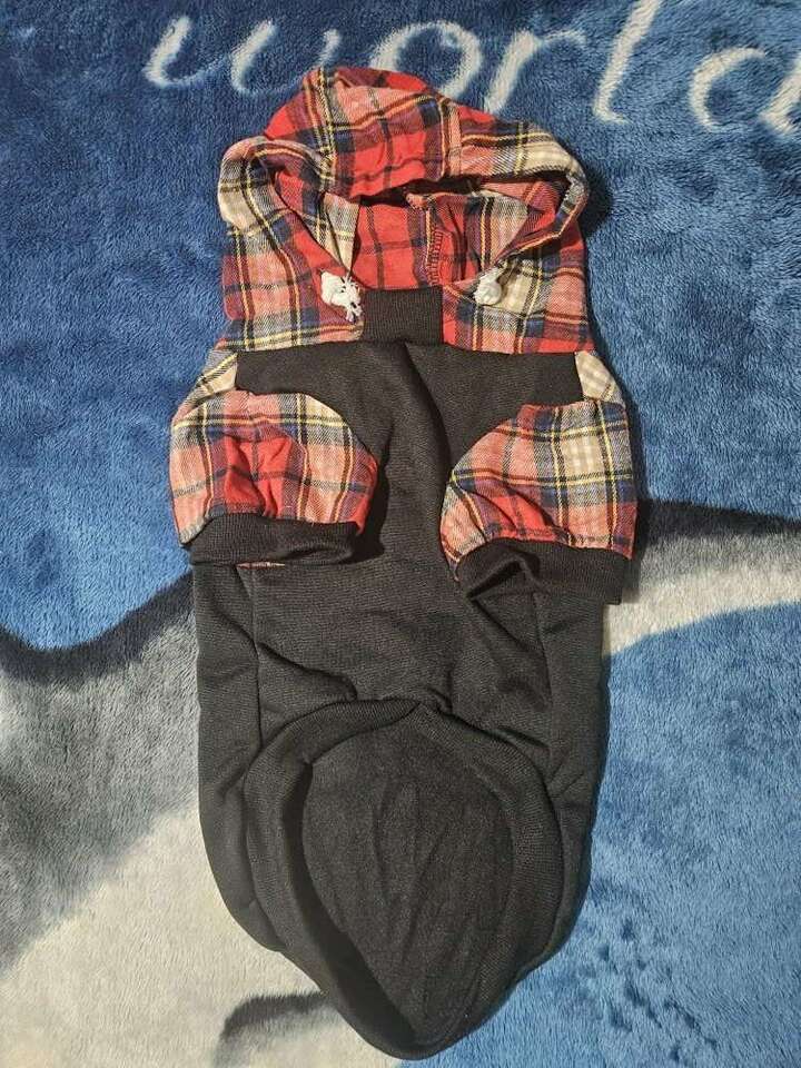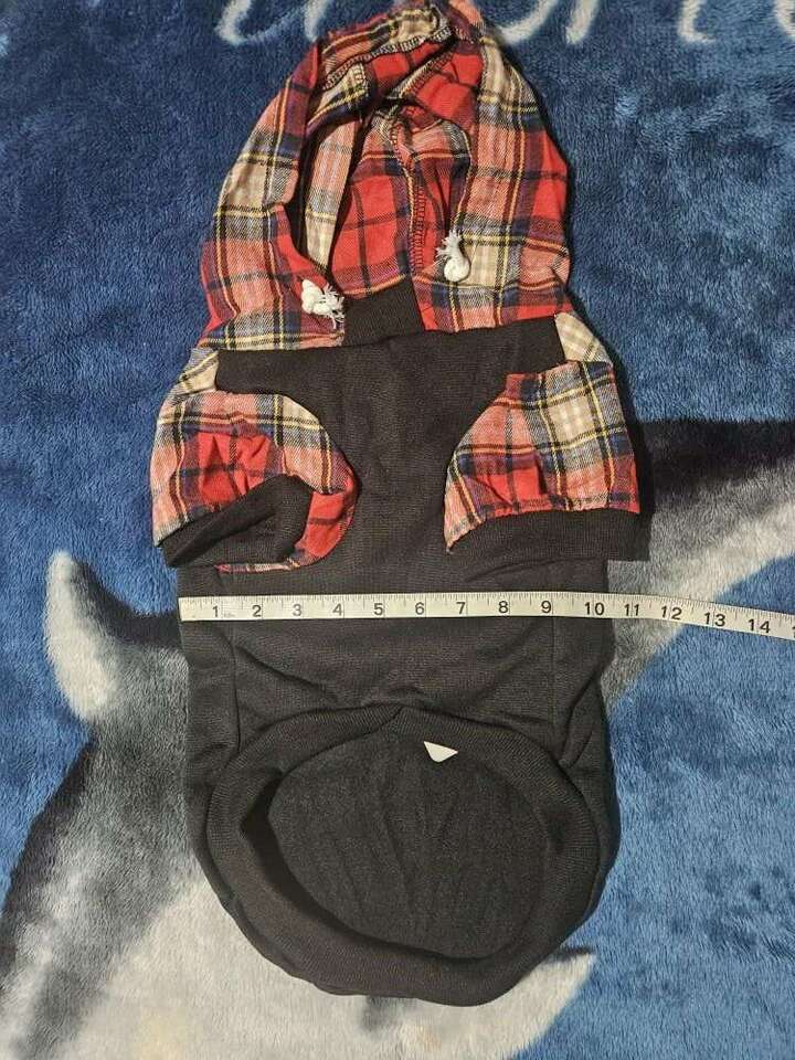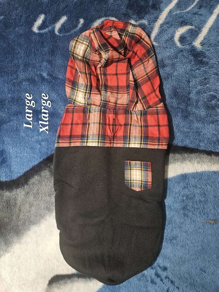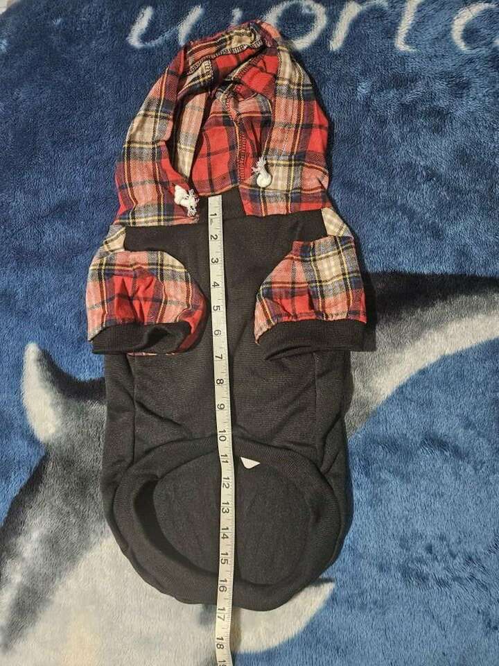 This sweater is new with tags. Tag says medium but it must be for bigger dogs. It's about a size large or extra large to me. Please double check the measurements in the pictures to make sure it will fit your dog. This is 100% Polyester All my items come from a smoke free home.