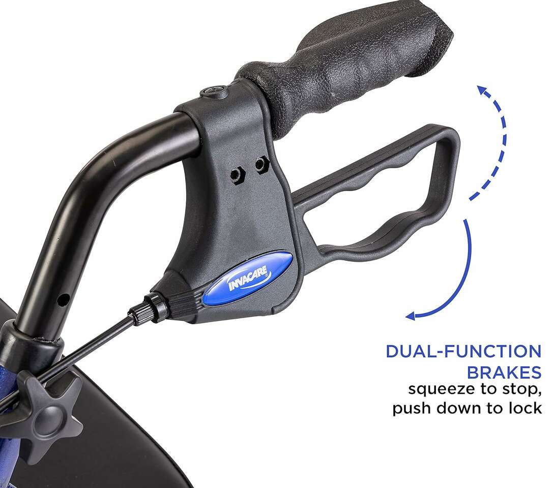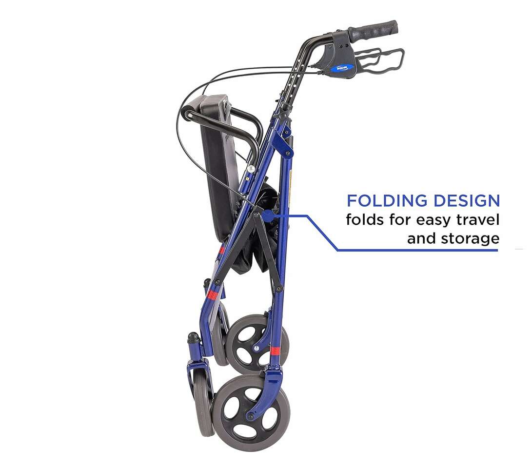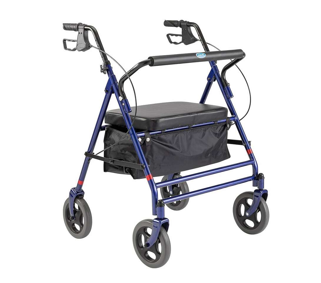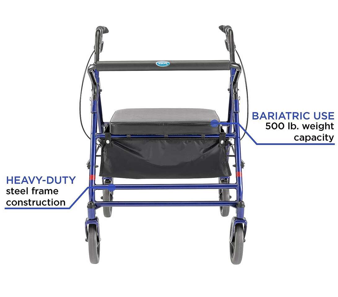 FEATURES: A flip-up, padded seat and removable backrest provide a place to sit down and rest comfortably, also includes under seat storage bag LARGE WHEELS: Smooth rolling 8'' wheels improve mobility over indoor surfaces and rougher terrain SPECIFICATIONS: Overall: 27x29.5 (WxD); Seat: 18x14x22 (WxDxH); Handles: 33-38 (H); Weight Capacity: 500 lbs.