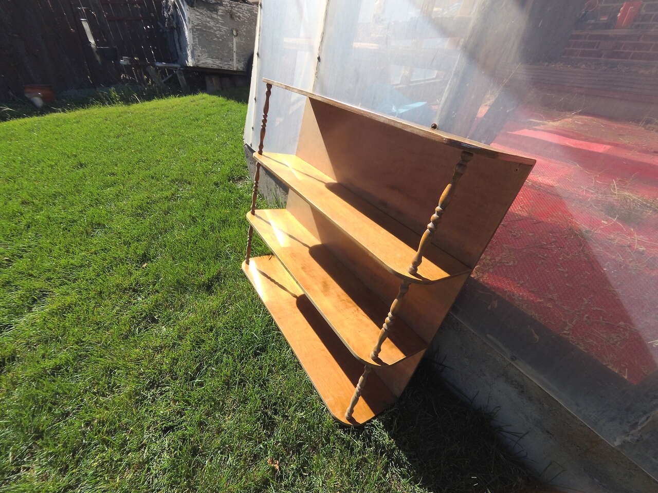 Approx. 3 feet wide, 32-1/4 inches tall, 10 inches between shelves, shelves 9 inches deep. Hand made.