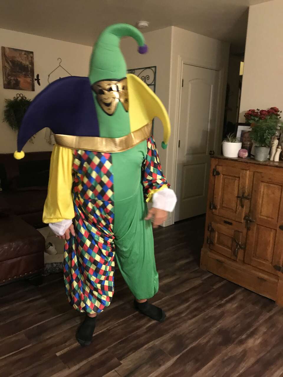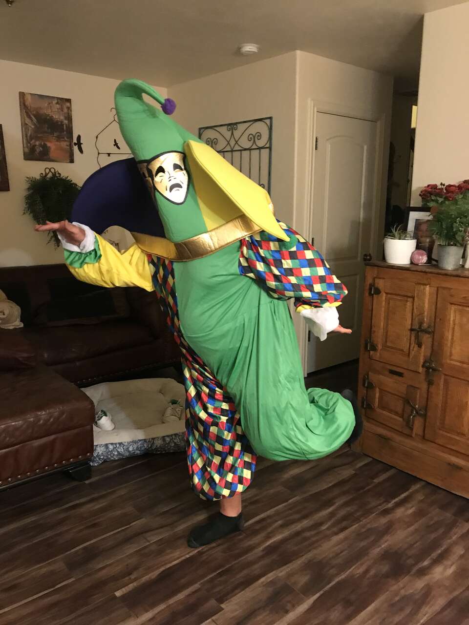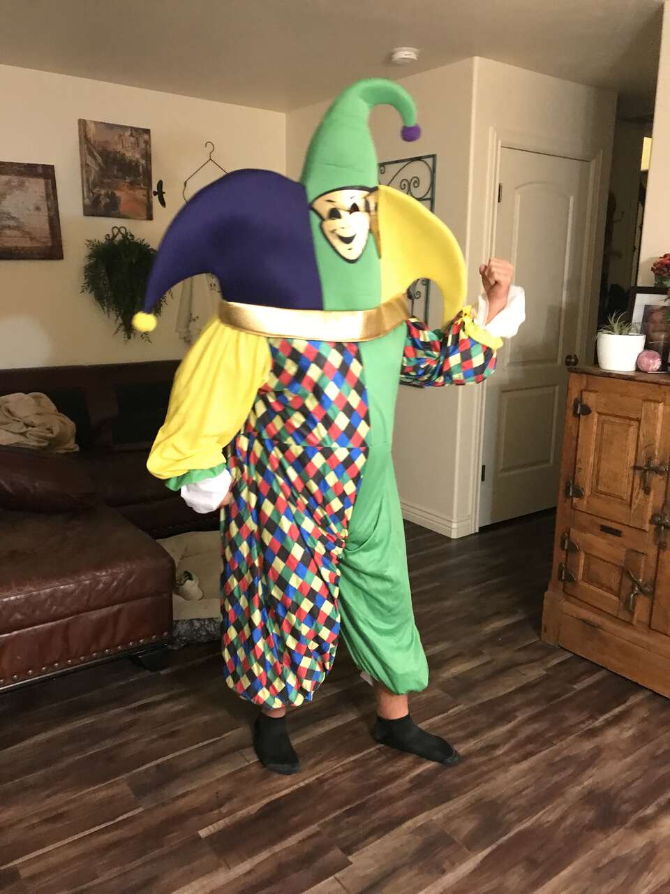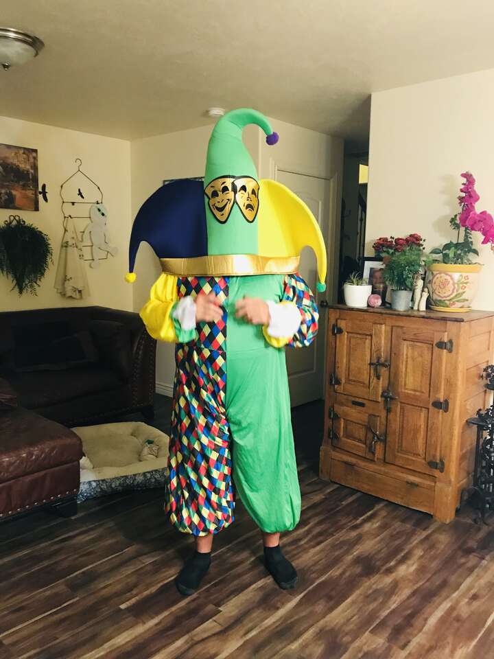 This is a professionally made jester costume with oversized head quality materials was $200 retail renting for $10 a night or buy it for $50.00