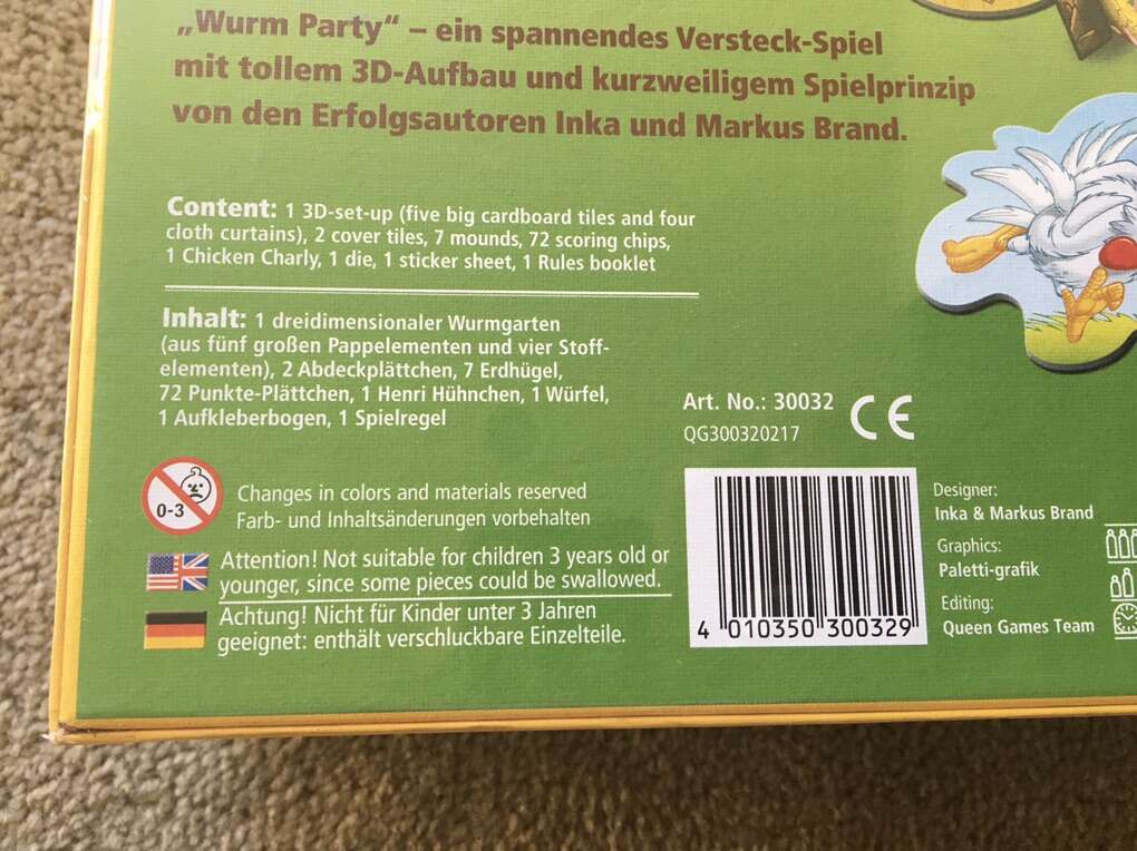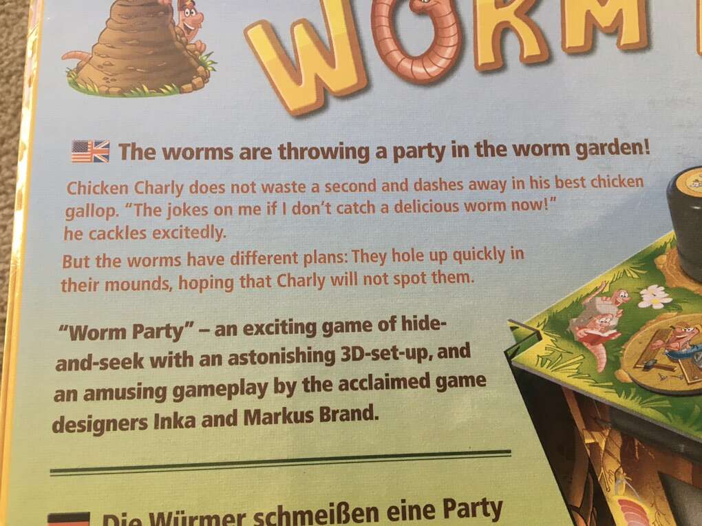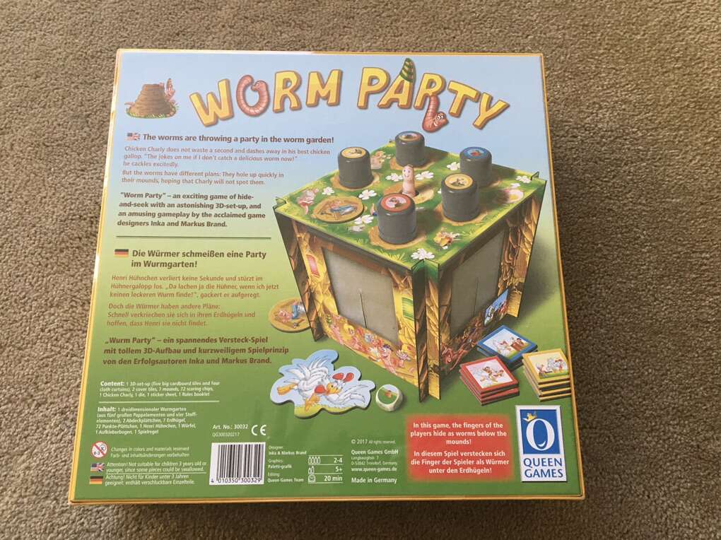 NEW (sealed in plastic) Worm Party Board Game. 2-4 players, ages 5+. By Queen Games, Inka & Markus Brand. Award-winning, high-quality game, made in Germany, 2017. New, unopened condition. Text only. Cash or Venmo.