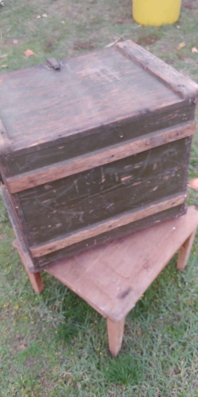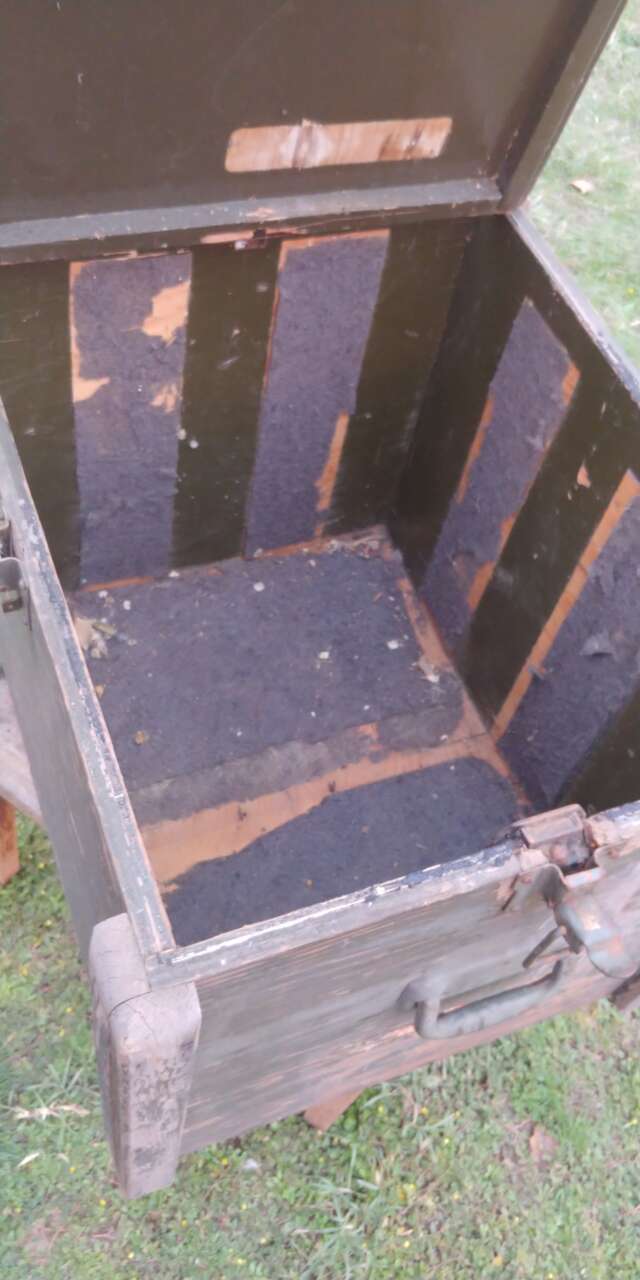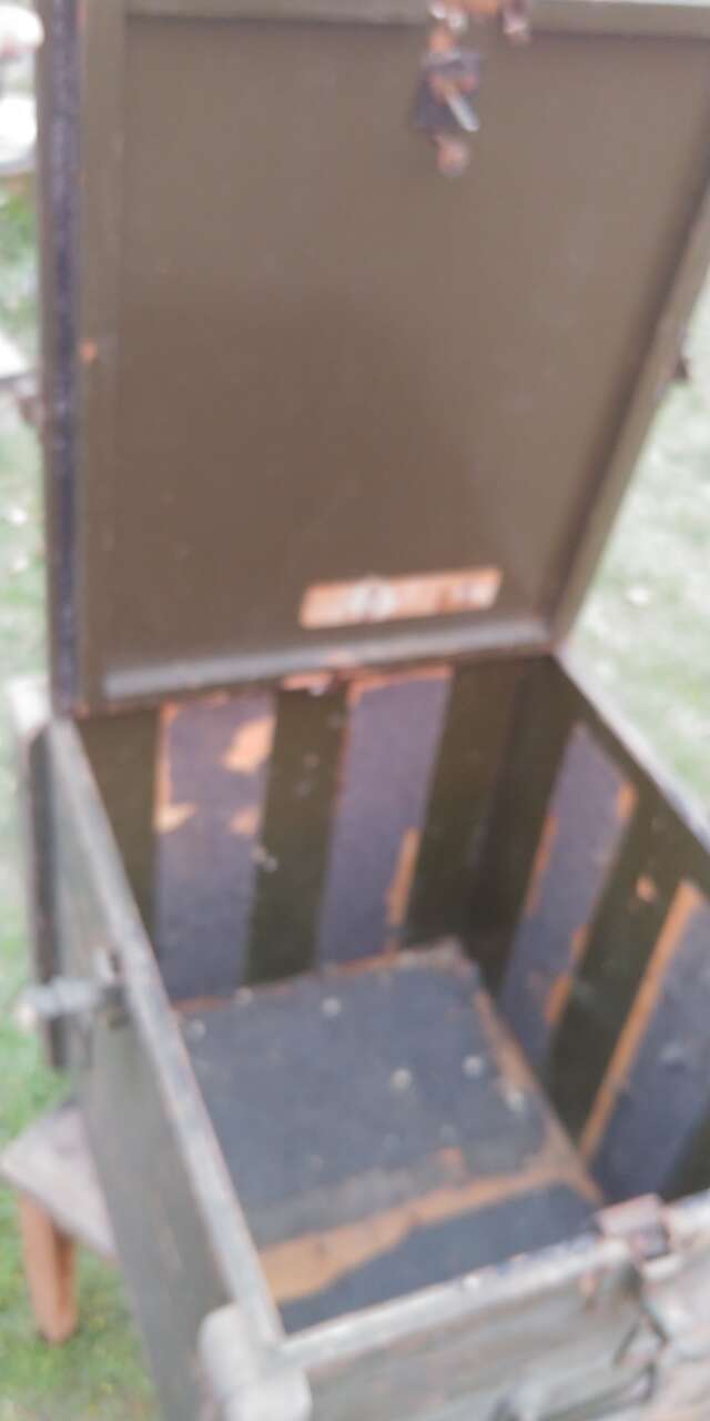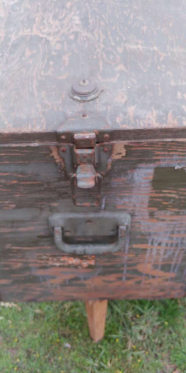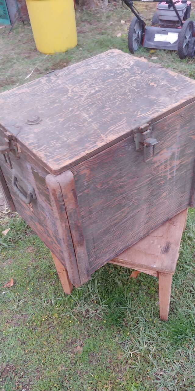 VenmoNice heavy trunk, storage box. 3/4 plywood. Latches on all sides, lid lifts off. Has lock, no key. Skids on bottom. Just cool.