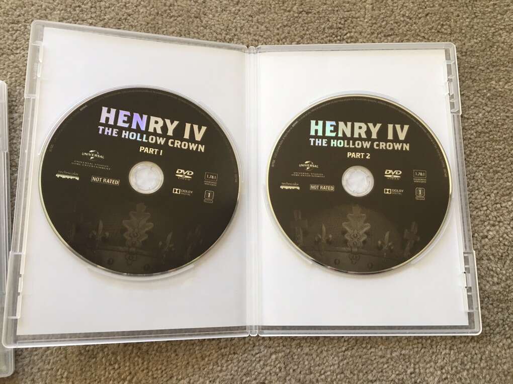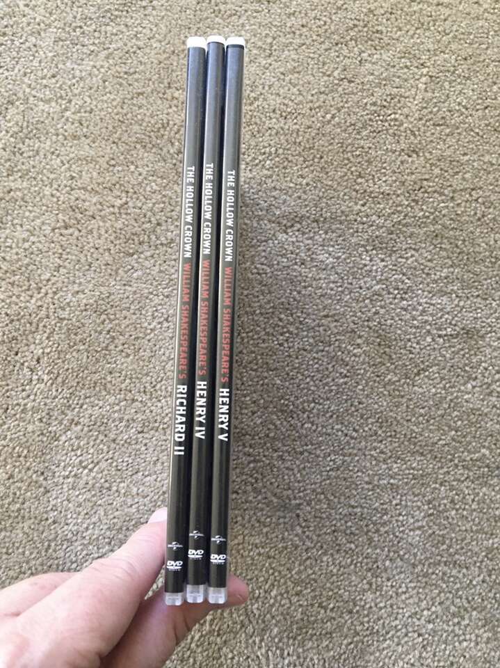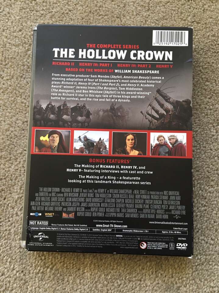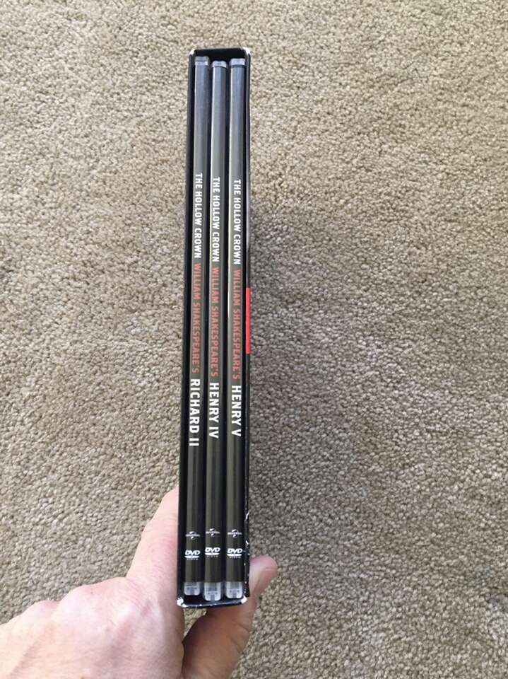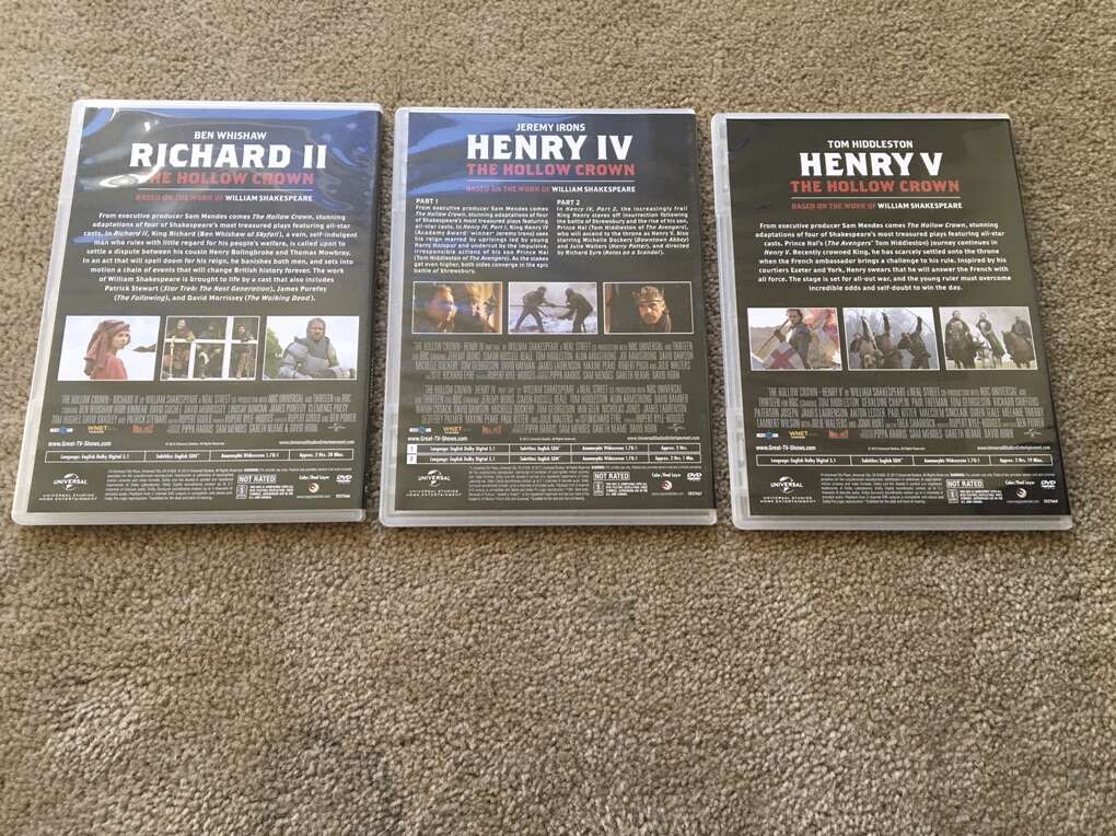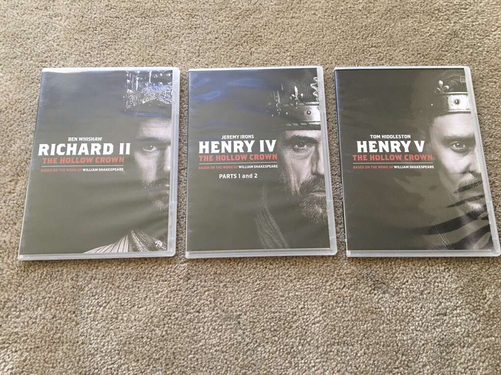 The Hollow Crown Complete Series DVDs: Richard II, Henry IV: Part 1, Henry IV: Part 2, and Henry V. Based on the works of William Shakespeare. Starring Ben Whishaw, Jeremy Irons, and Tom Hiddleston. This is an amazing series with a stellar cast. Discs in excellent condition. Text only. Cash or Venmo. Discount on multiple items.