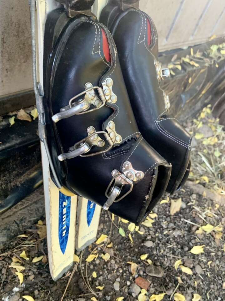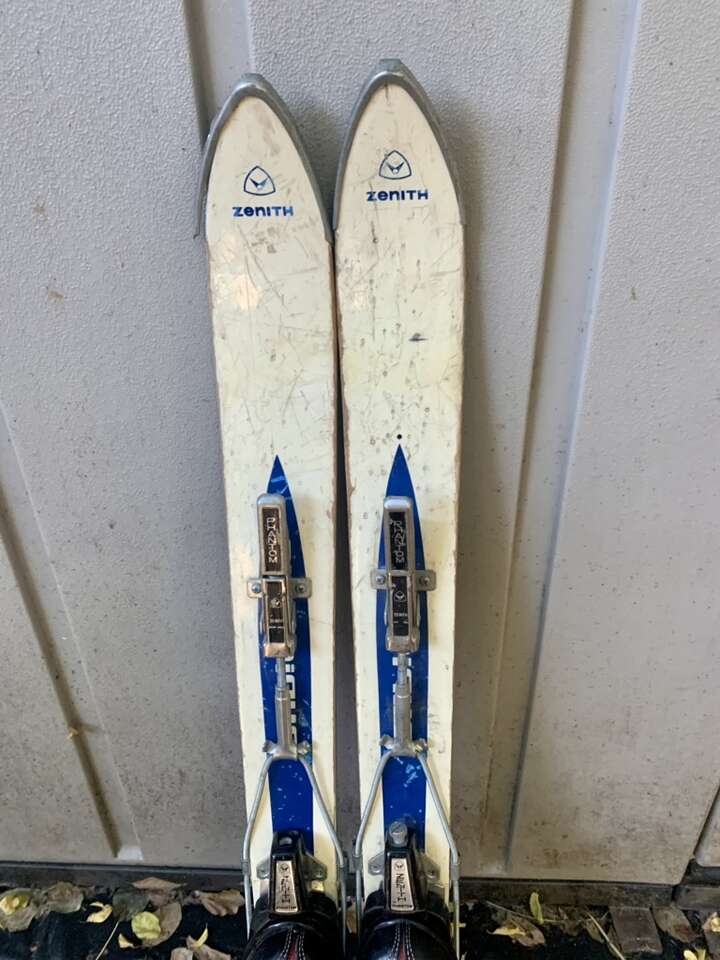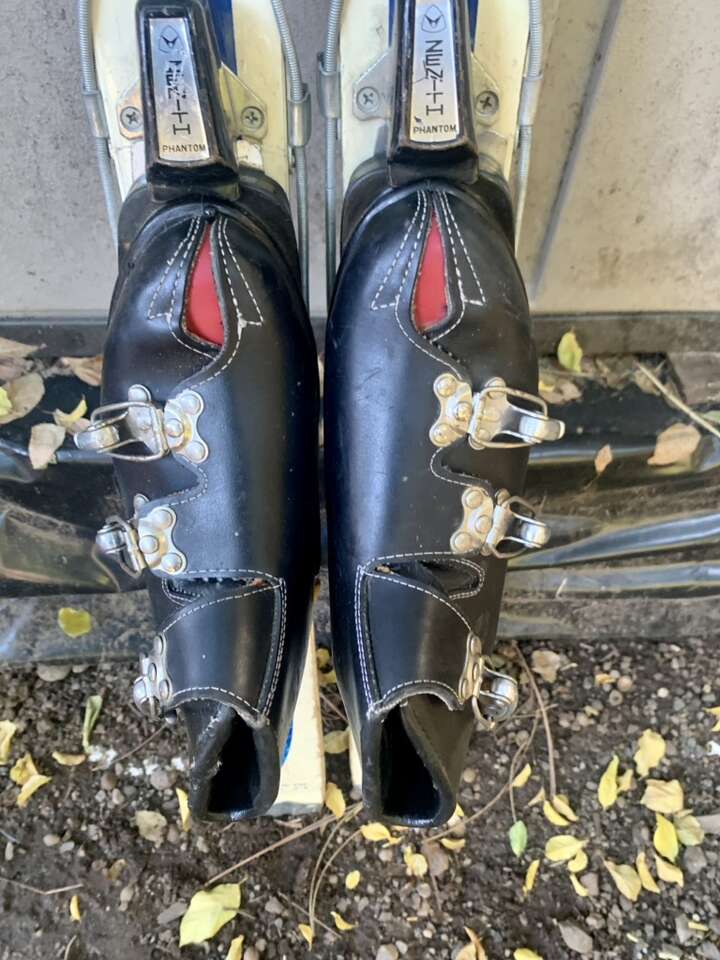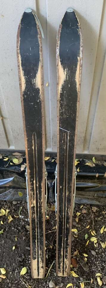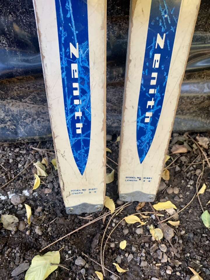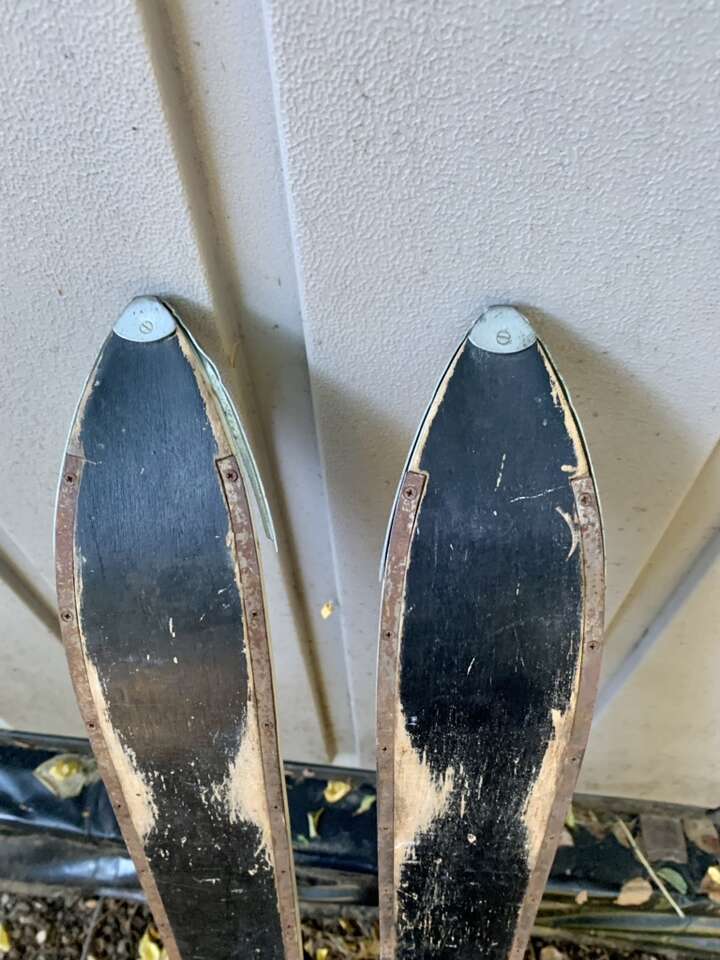 Got a set of 60s wood skis from a, now, defunct brand. Skis have lots of nice patina wear that makes em great for decor. Definitely were used well. They are 107cm long, and they come with 60s leather buckle kids ski boots in excellent condition. Harder to find the small boots. Great for collecting or decor!