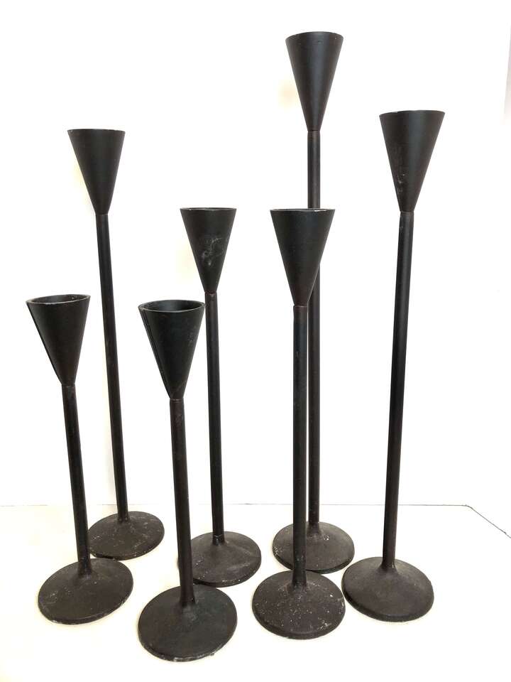 VenmoJust $10 each. Just in time for the holidays!! ......Pottery Barn Mid Century Modern, Iron Brutalist Petaluma, Hand Hammered Candle Holders range in 12 - 18 inch heights.