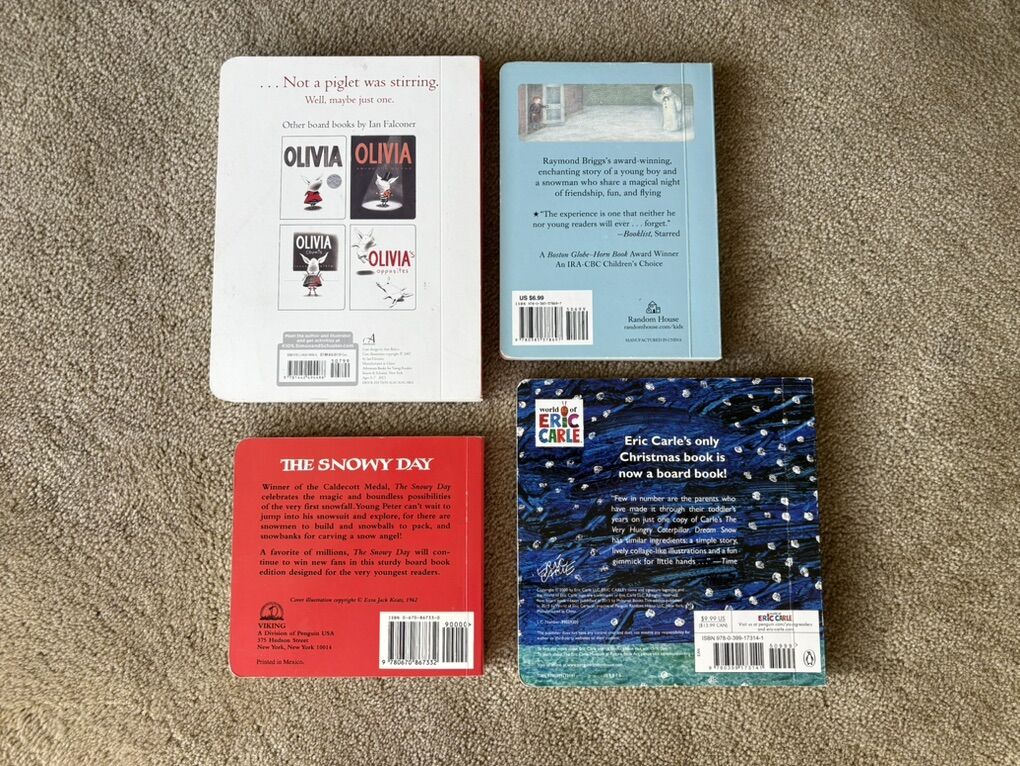 Four Classic Winter Board Books: Olivia Helps with Christmas, The Snowman, The Snowy Day, and Dream Snow. All in very good condition. Slight wear on corners (see photos). Text only. Cash or Venmo.