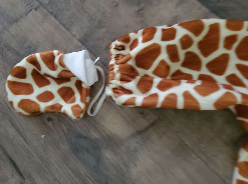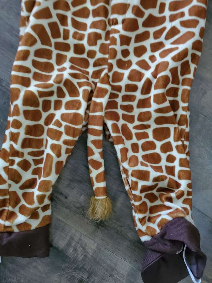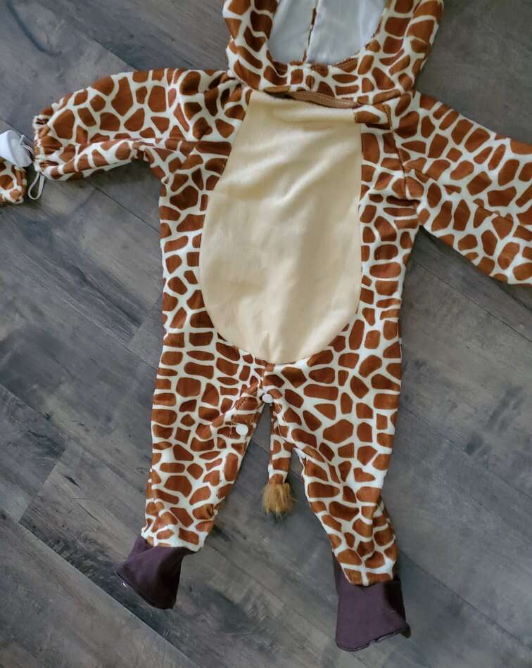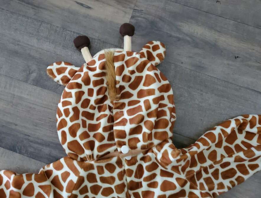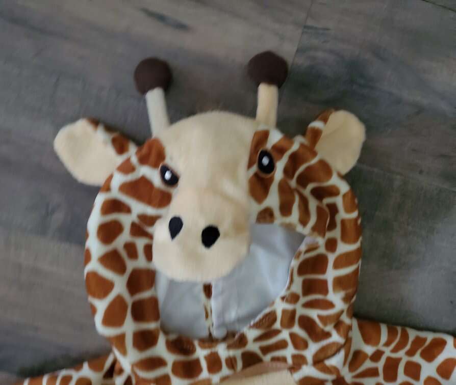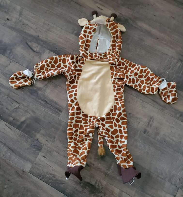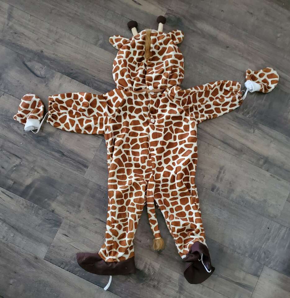 Adorable giraffe costume with head piece that is easily removable and mittens. For babies 6-12 months old. Text please!