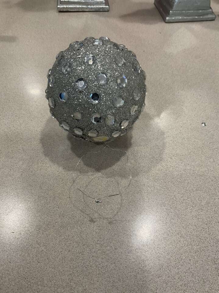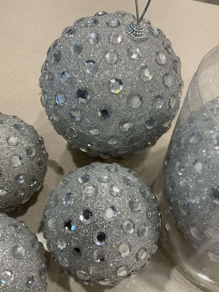 These are sparkly and kinda remind me of a disco ball. The large are 6 inches and the small are 3-4 inches . One of the small ornaments is missing it’s top but has a wire for hanging