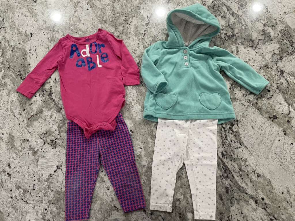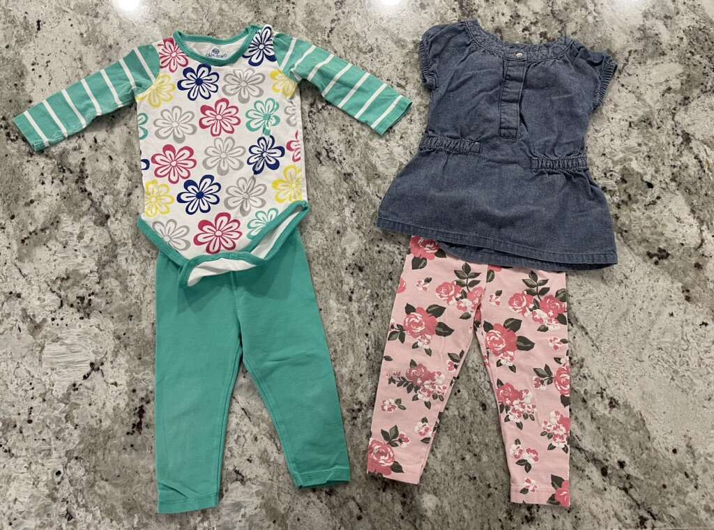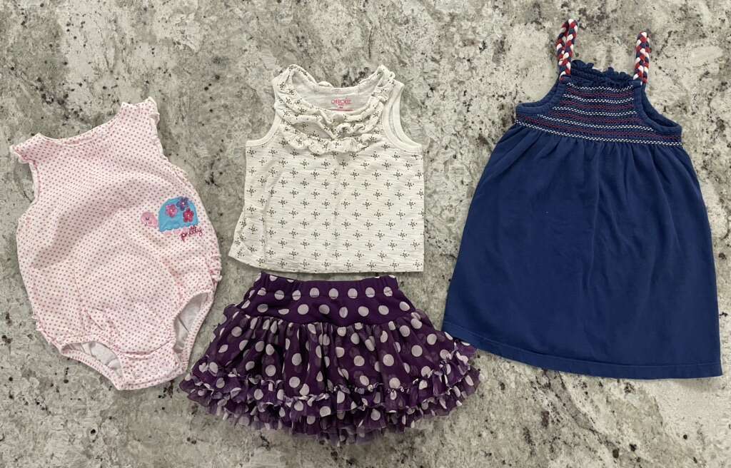 1 Jacket 1 tank top 1 4th of July dress 1 romper 1 skirt 2 t-shirt onesies 2 long sleeve onesies 2 pants 3 capris 4 outfits