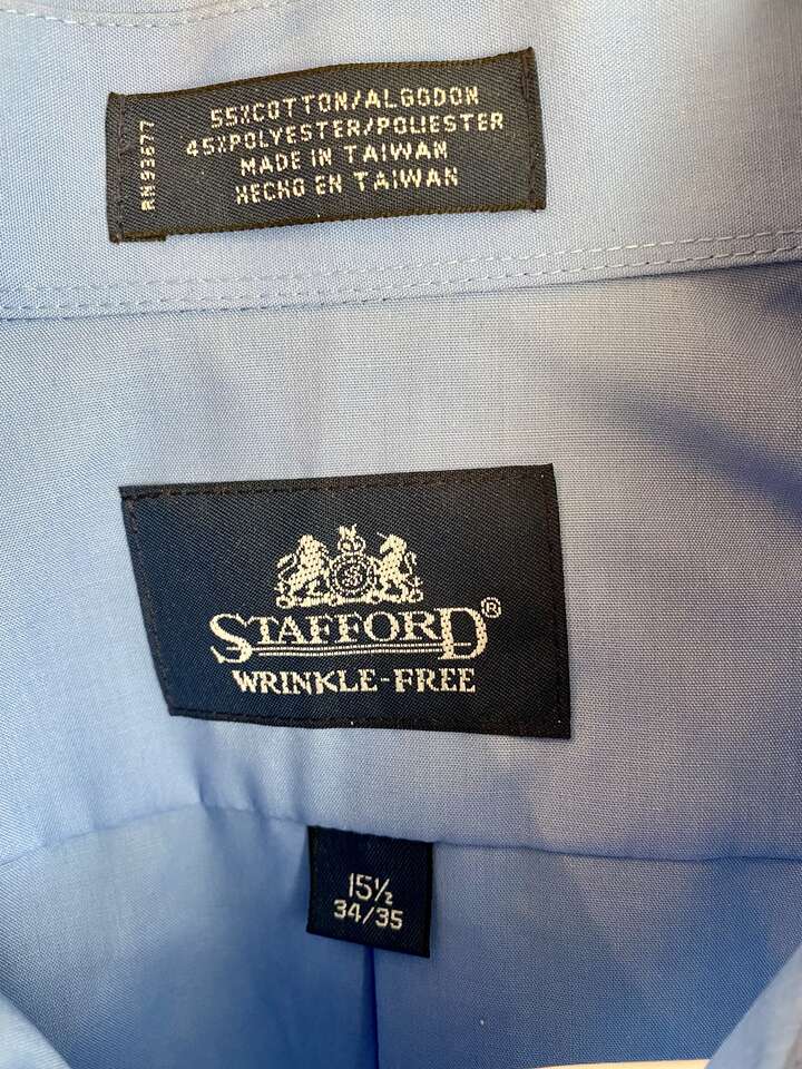 LIKE NEW - Mens Stafford Lt Blue Wrinkle Free Dress Shirt with Pocket - SZ 15.5 34/35 - C PICS. I'm not sure if this premium dress shirt has ever been worn. My window has cut glass so that is the imperfection you can see on the left side reflection. I'm listing many Mens shirts so check out my other listings.