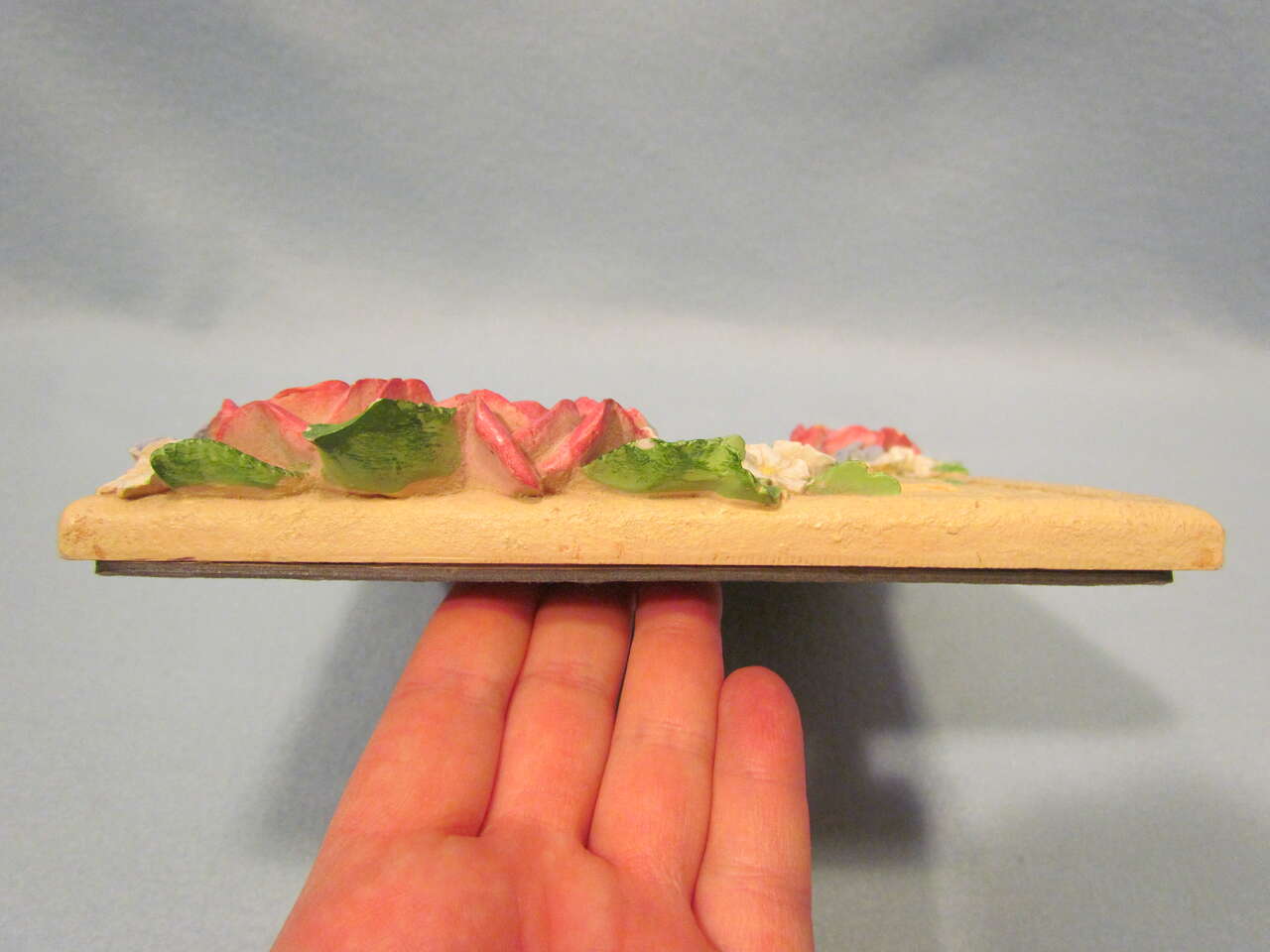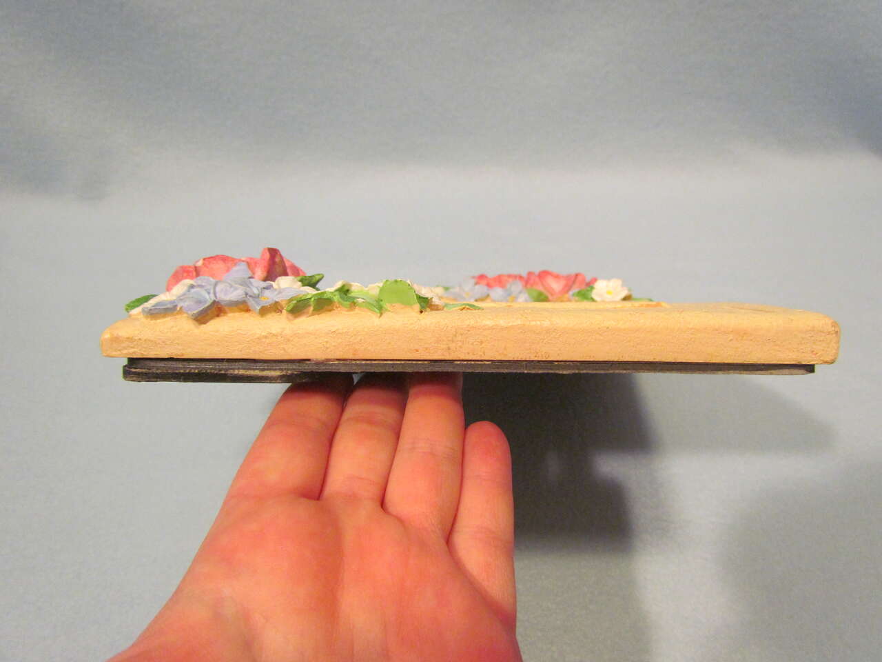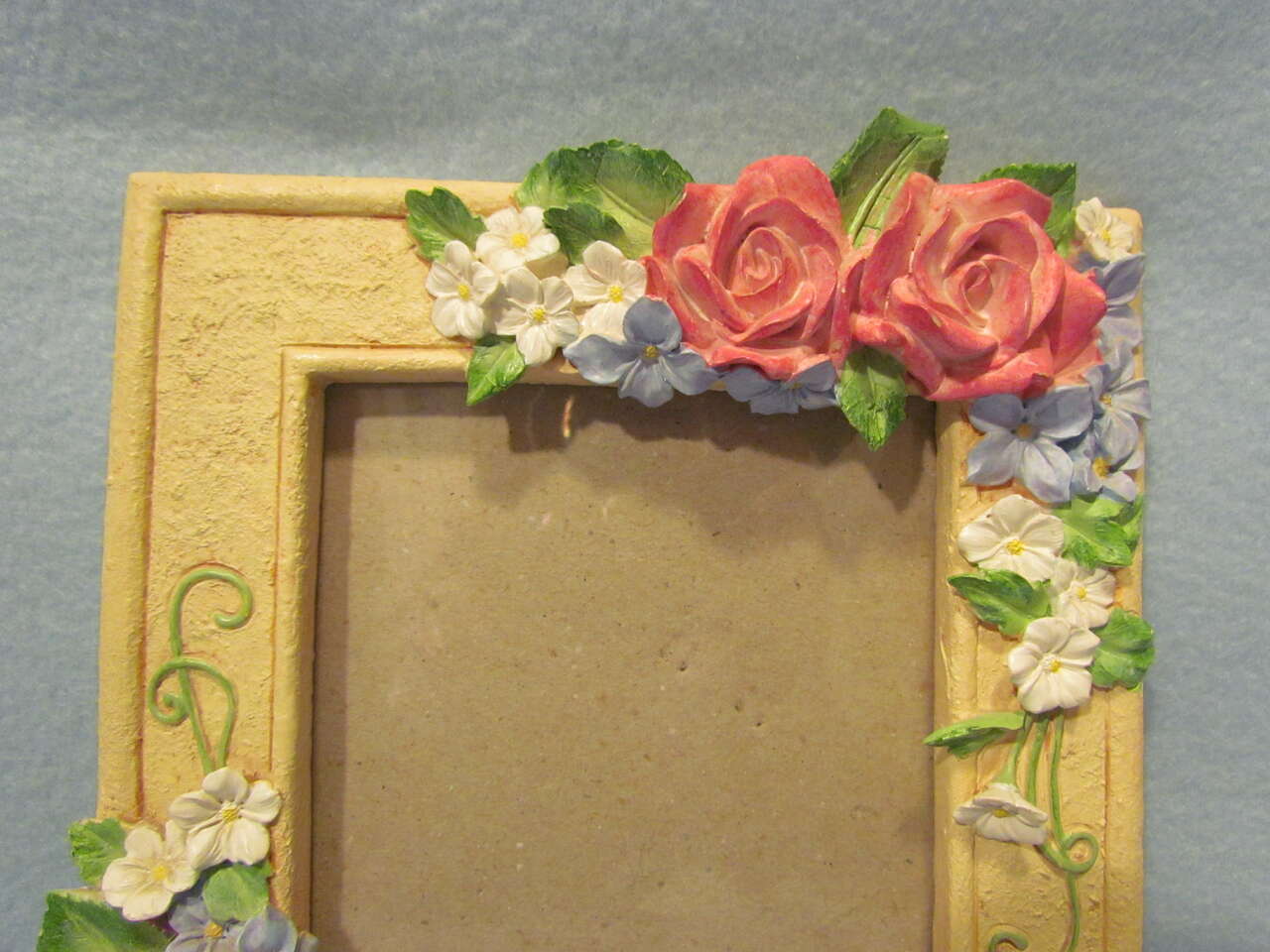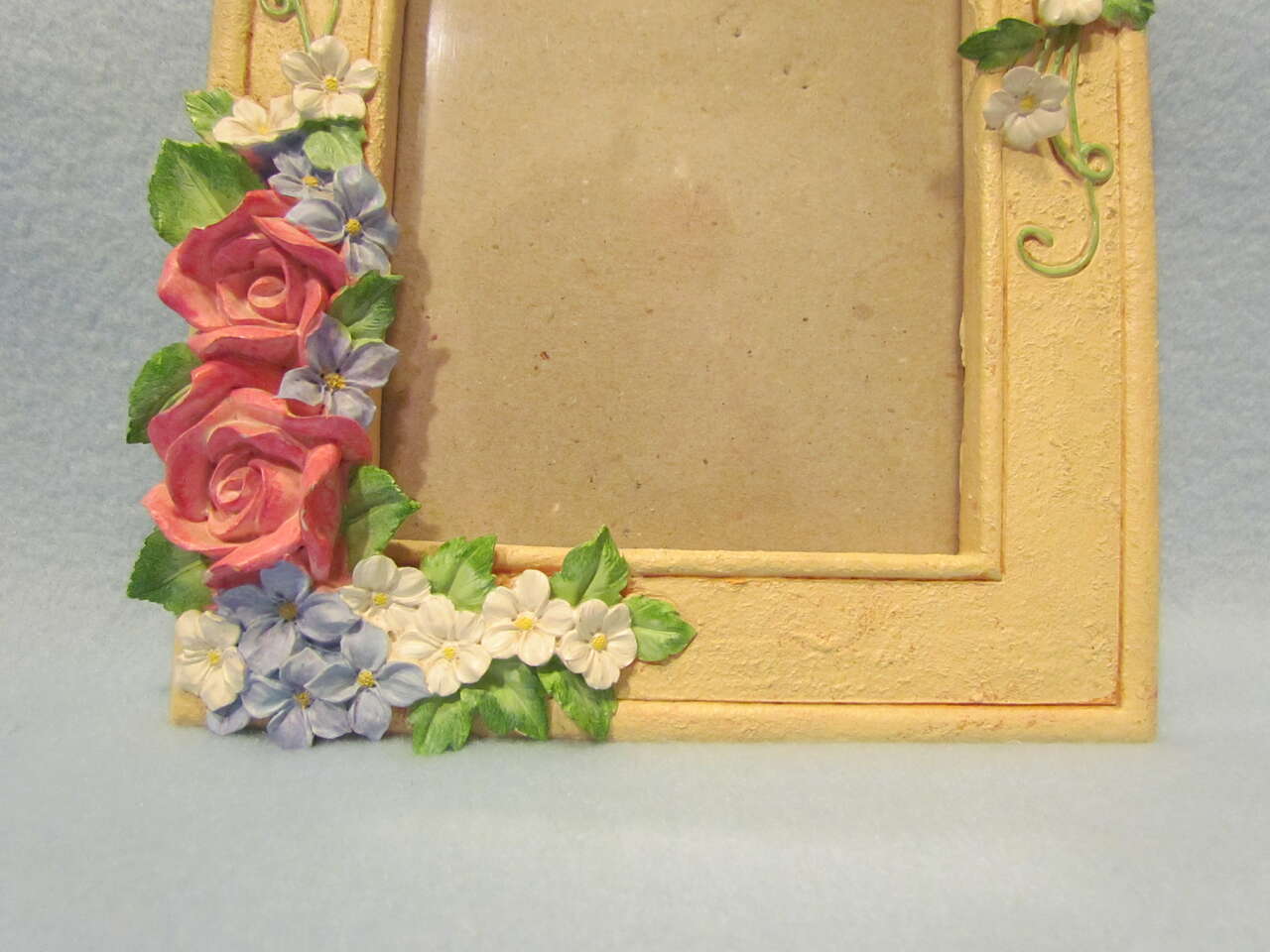 This lovely frame will attractively highlight any photo placed inside it. The base color is a beige/tan with pink roses, green leaves, blue bluet (Houstonia caerulea) flowers, & white cherry blossoms. Frame is approximately 10" tall and 7.75" wide with a 5" x 7" picture opening. The flowers have a few imperfect spots of a small chip or rubbed off paint that adds to its character. Overall this frame is in nice gently pre-owned condition.
