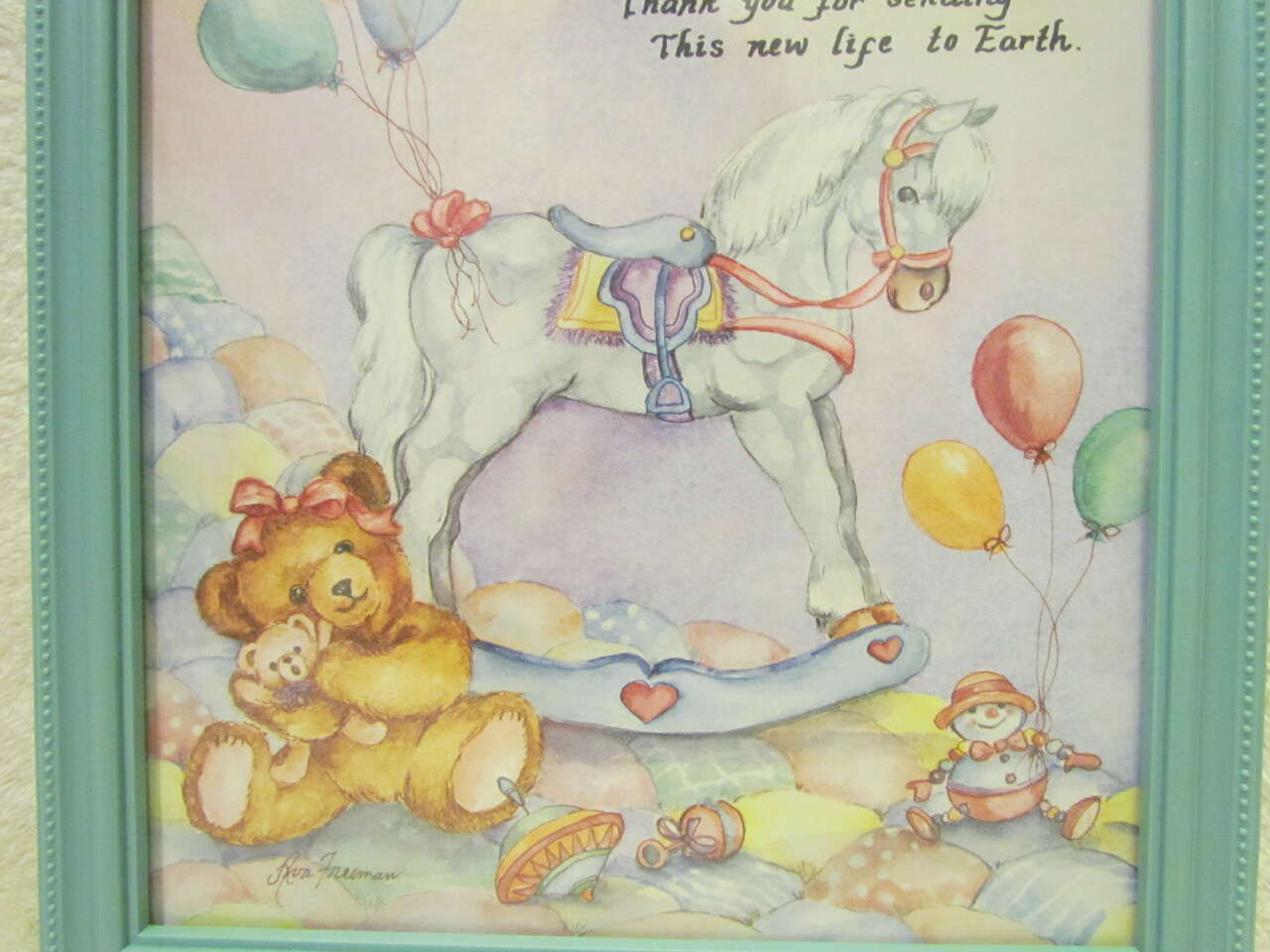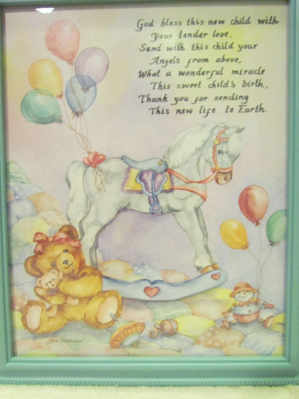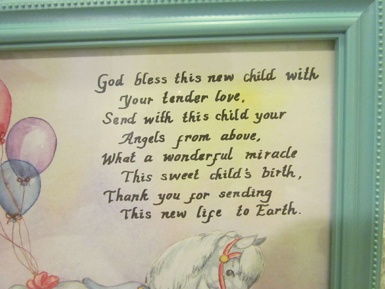 Lovely Home Interiors “God Bless This Child” print under glass with a baby green resin frame. Measures 9 ¼” x 11 ¼”. Adorable decoration for any new baby’s room. Poem says:
