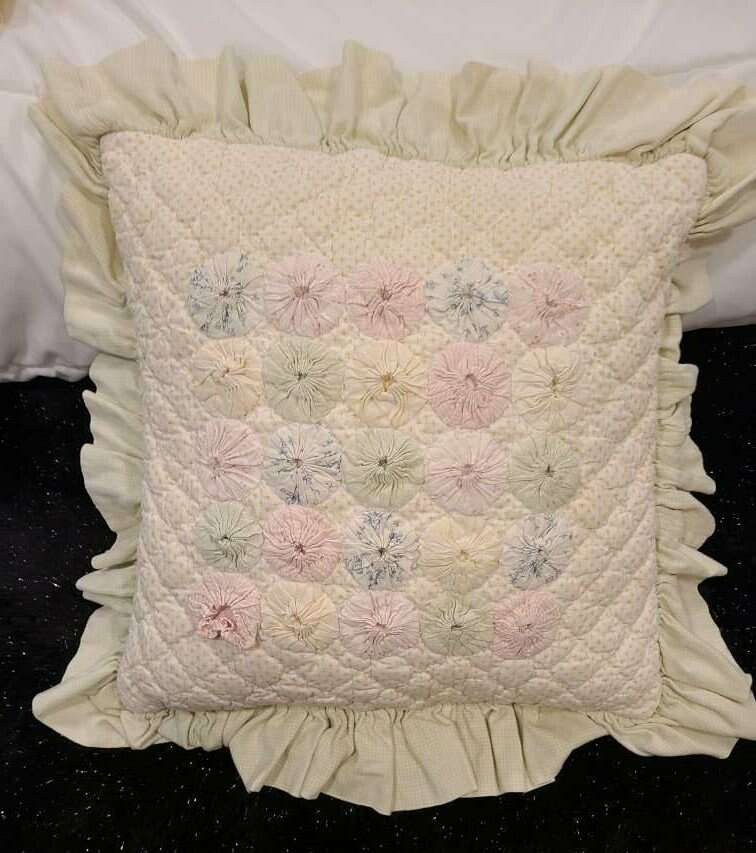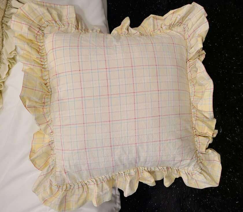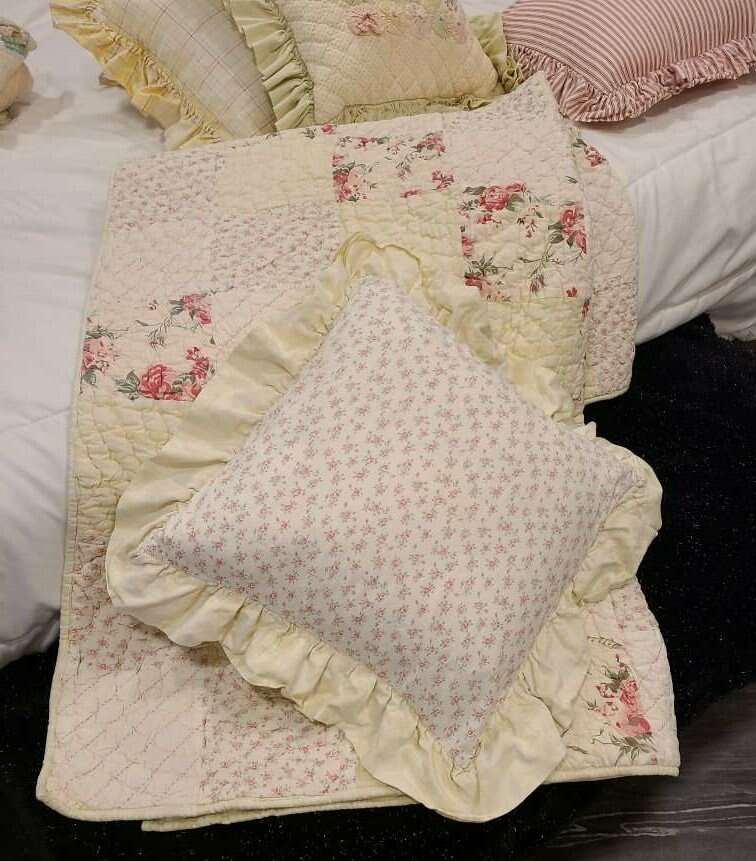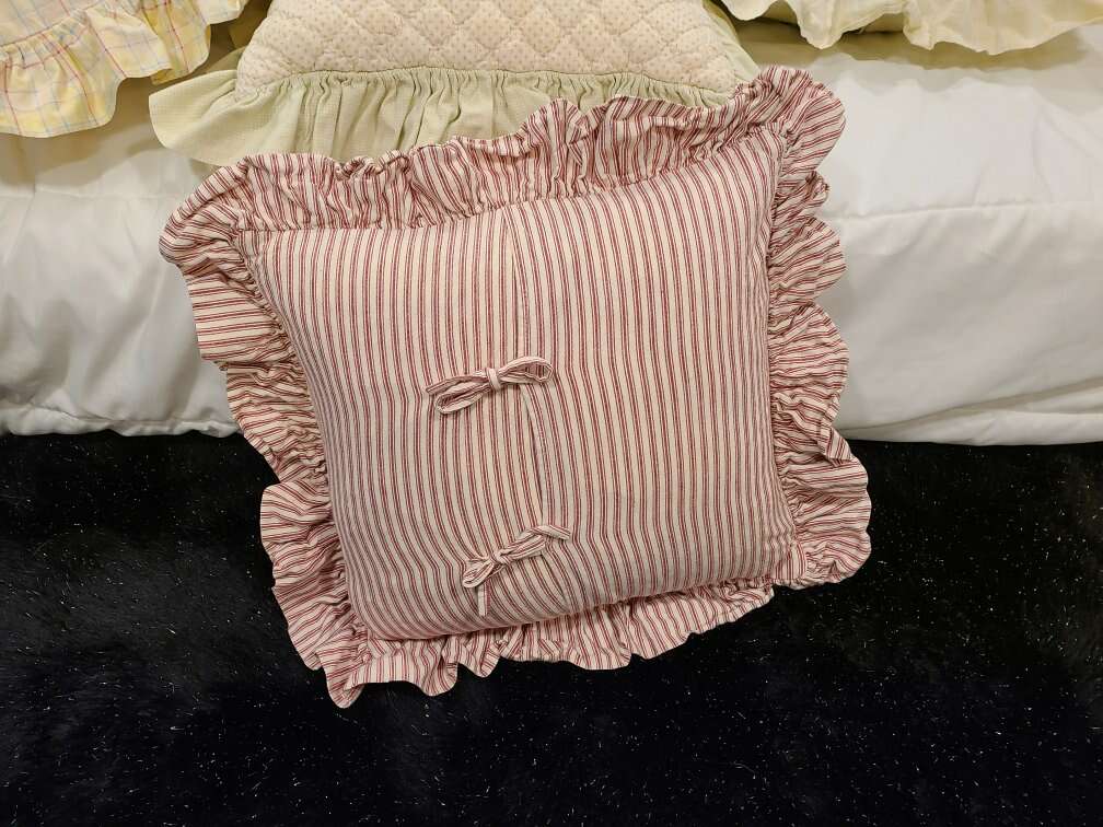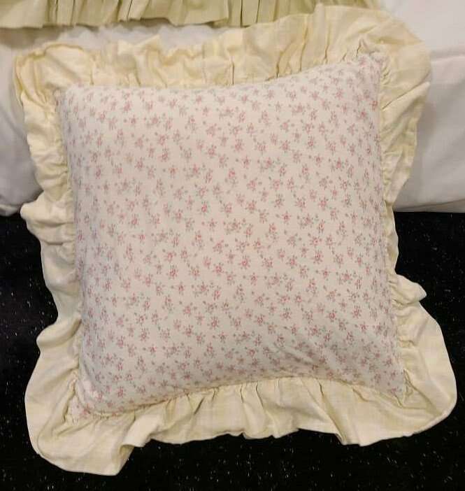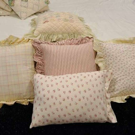 Feather Down Filled Accent Pillows and Shams. 16 x 16 - 3 13 x 18 -1 Lasting Impressions by Victorian Heart. They were used as decore in a business. Shabby Cic, Cottage Core, Granmillinial Will sell separately for $25 each. Quilt sold separately, not included.