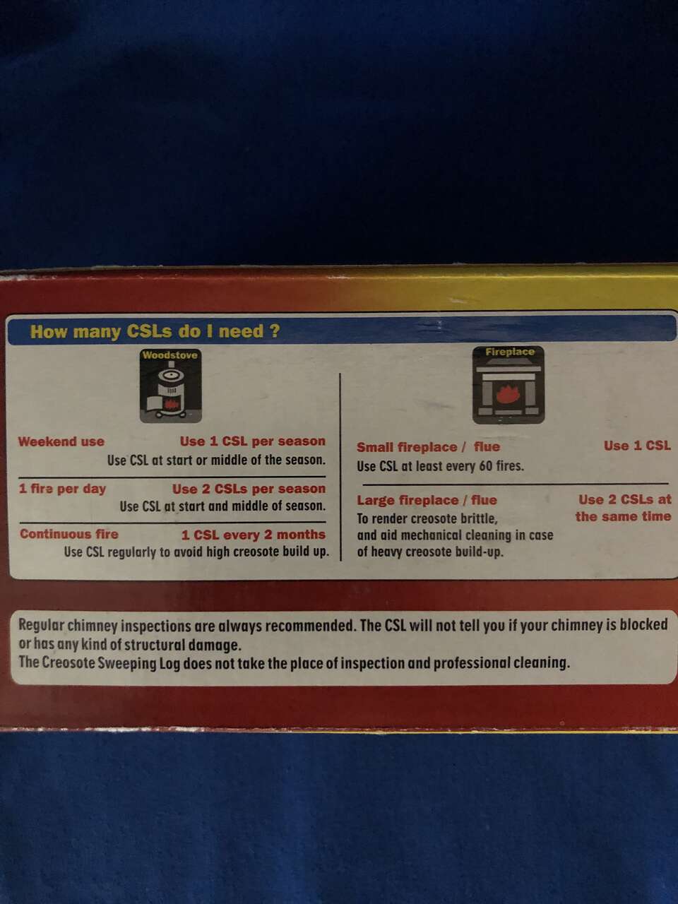 VenmoCreosote Sweeping Log - New. Never opened. A simple and effective solution for cleaning your chimney while enjoying your fireplace. The Creosote log minimizes future build up of creosote , suitable for both fireplaces and woodstoves. Burns up to 2 hours.