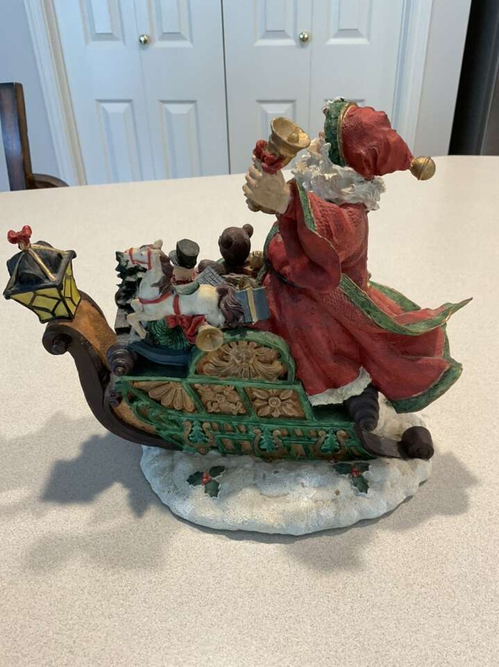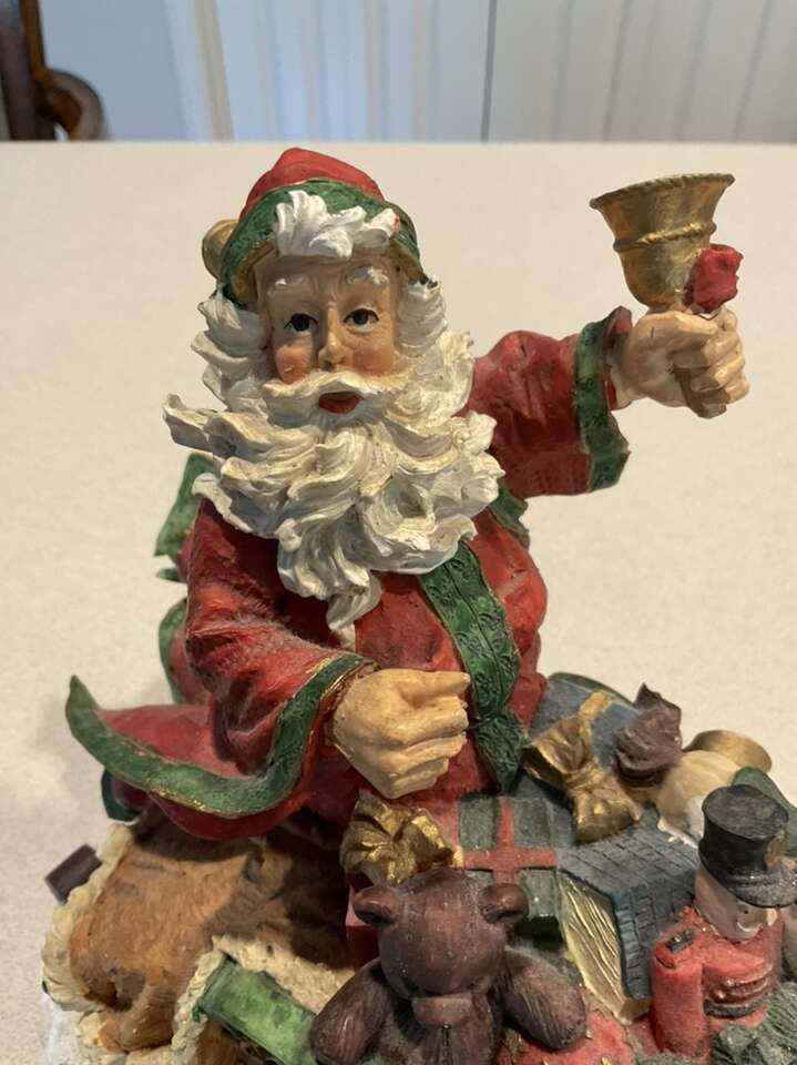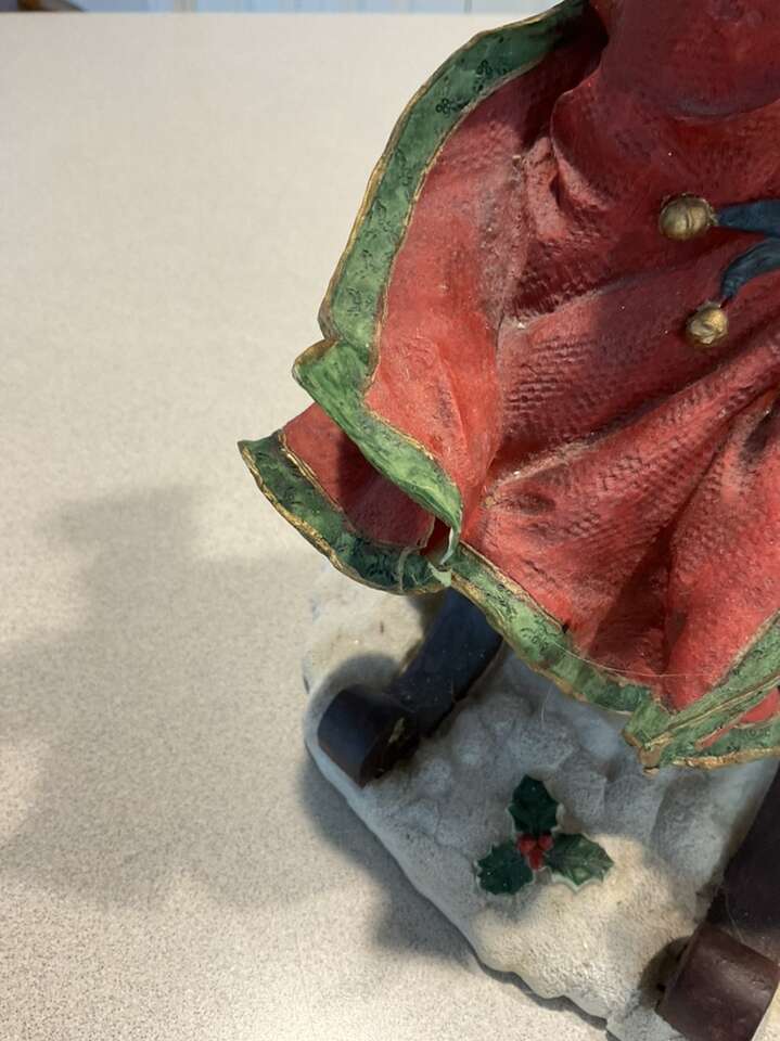 Sorry as I look at the pictures I posted this cute Santa looks dusty. I did clean it so it does looks a lot brighter. This is a vintage figure. It is very delicate. It measures 10x10 inches. It does have a tiny bit missing on his coat reference picture.