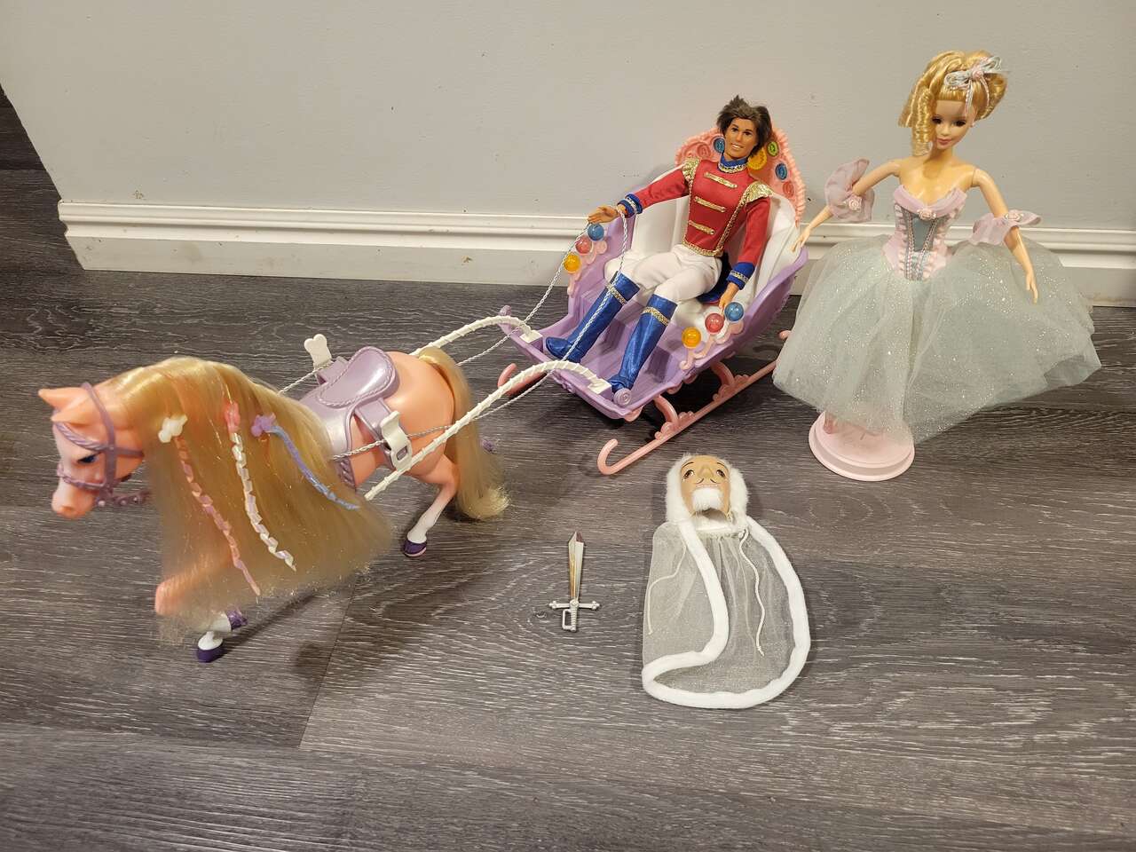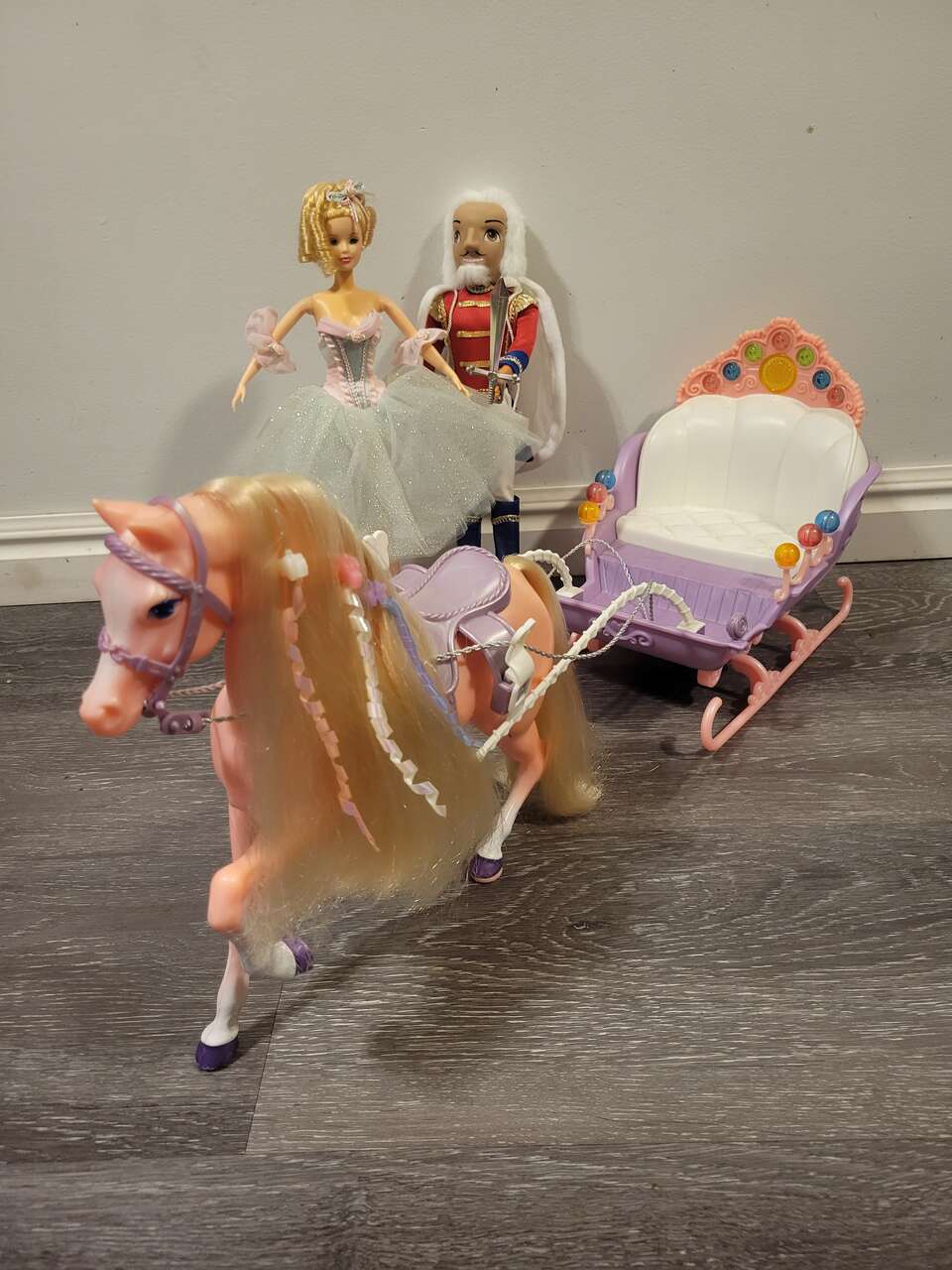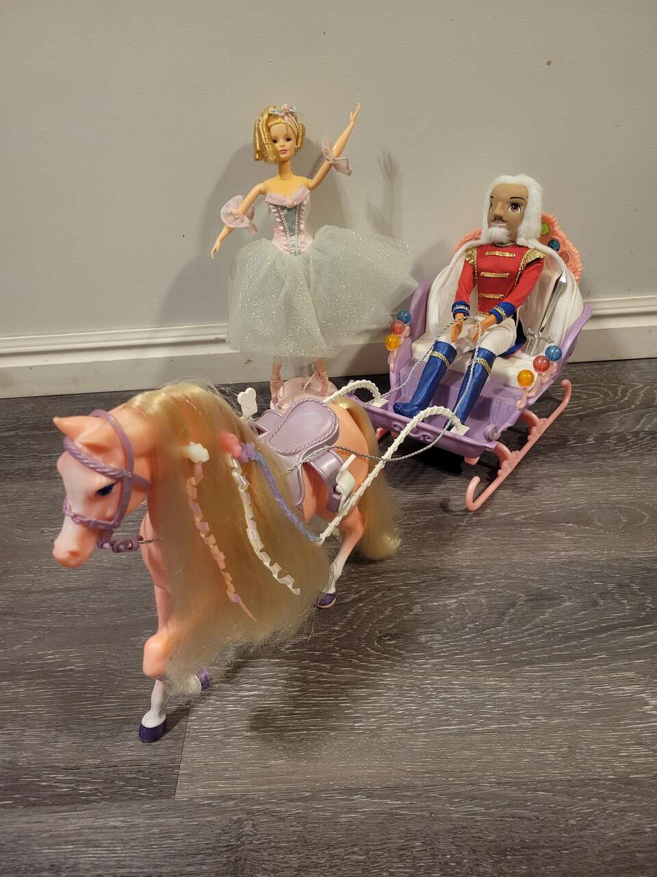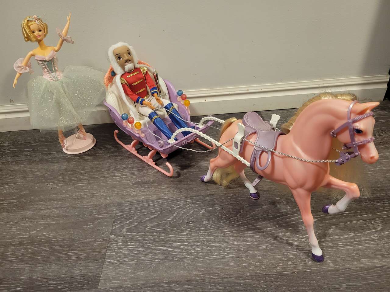 Barbie Nutcracker, Marzipan, and The Candy Sleigh Mattel Horse Carriage Rare, with little tommy