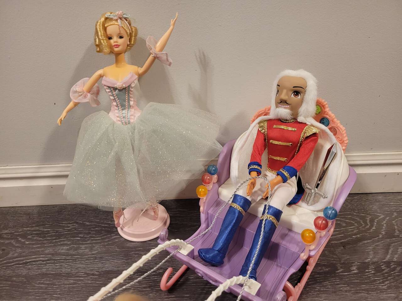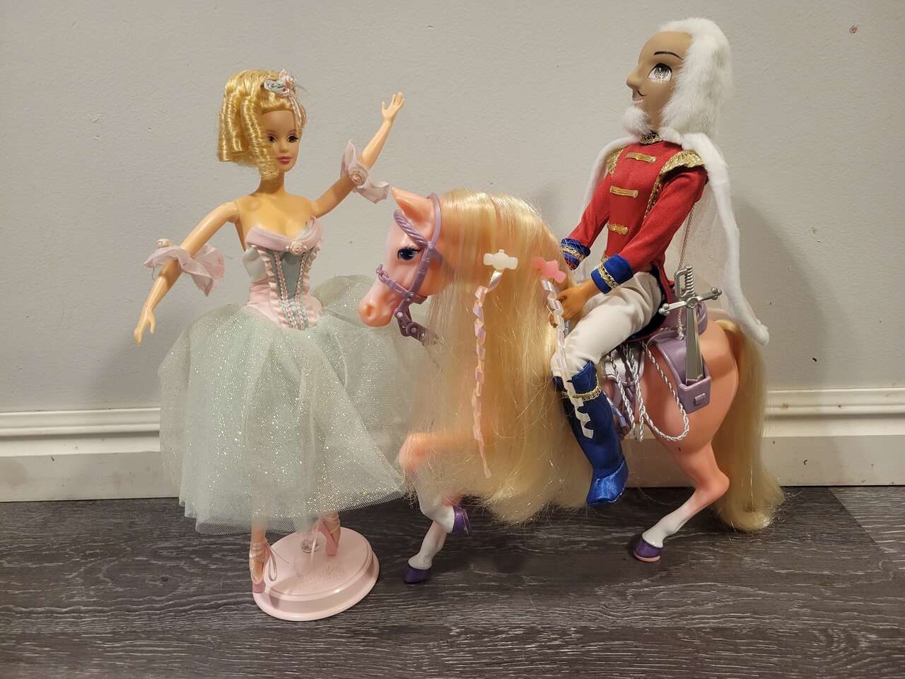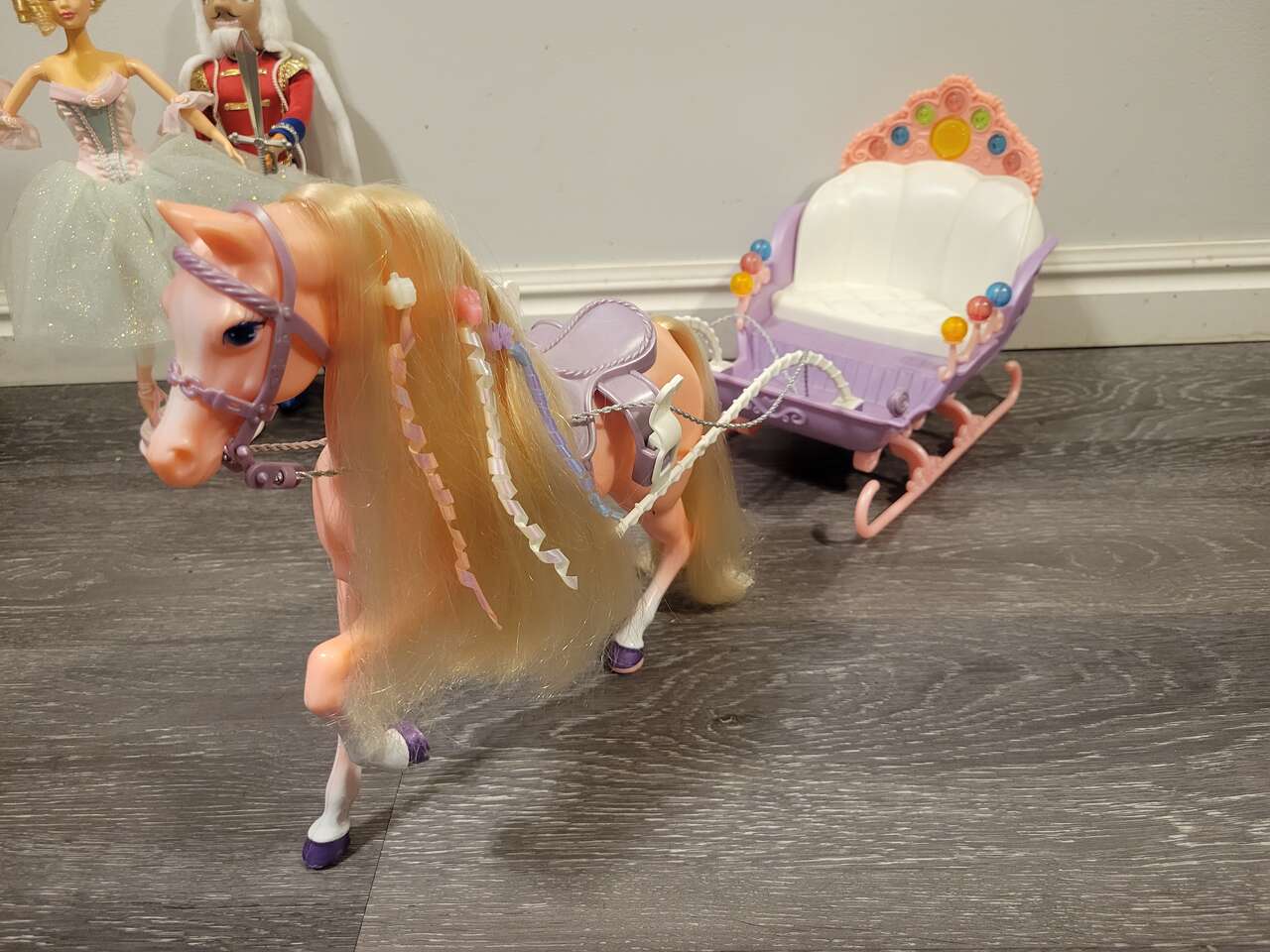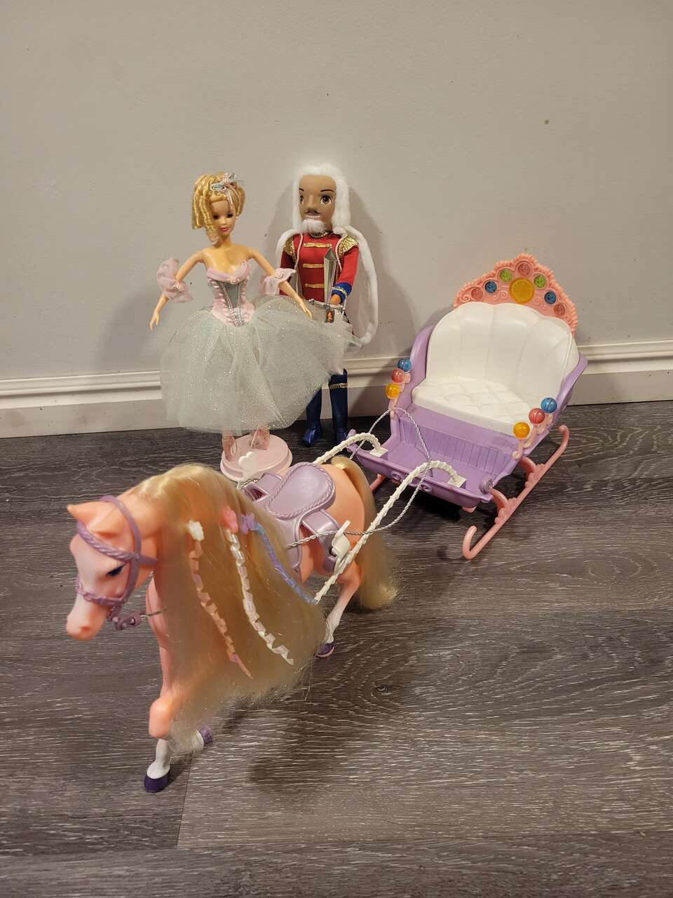 Barbie Nutcracker, Marzipan, and The Candy Sleigh Mattel Horse Carriage Rare, with little tommy