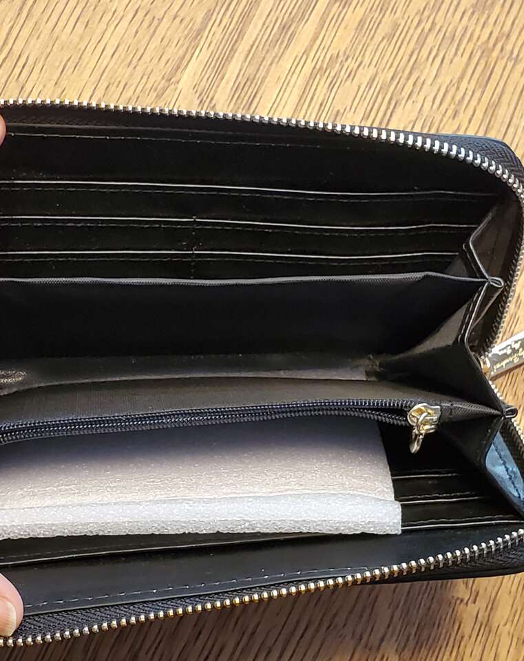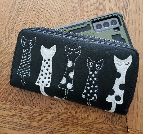 Embroidered Cat Wallet, Clutch. Lovely Bownot Multiple Card, Check, Coin, Paper Money Holders. This Wallet is large enough to hold a Cell Phone. Faux Leather, Goldtone Zip Around. Cash Only, No Codes
