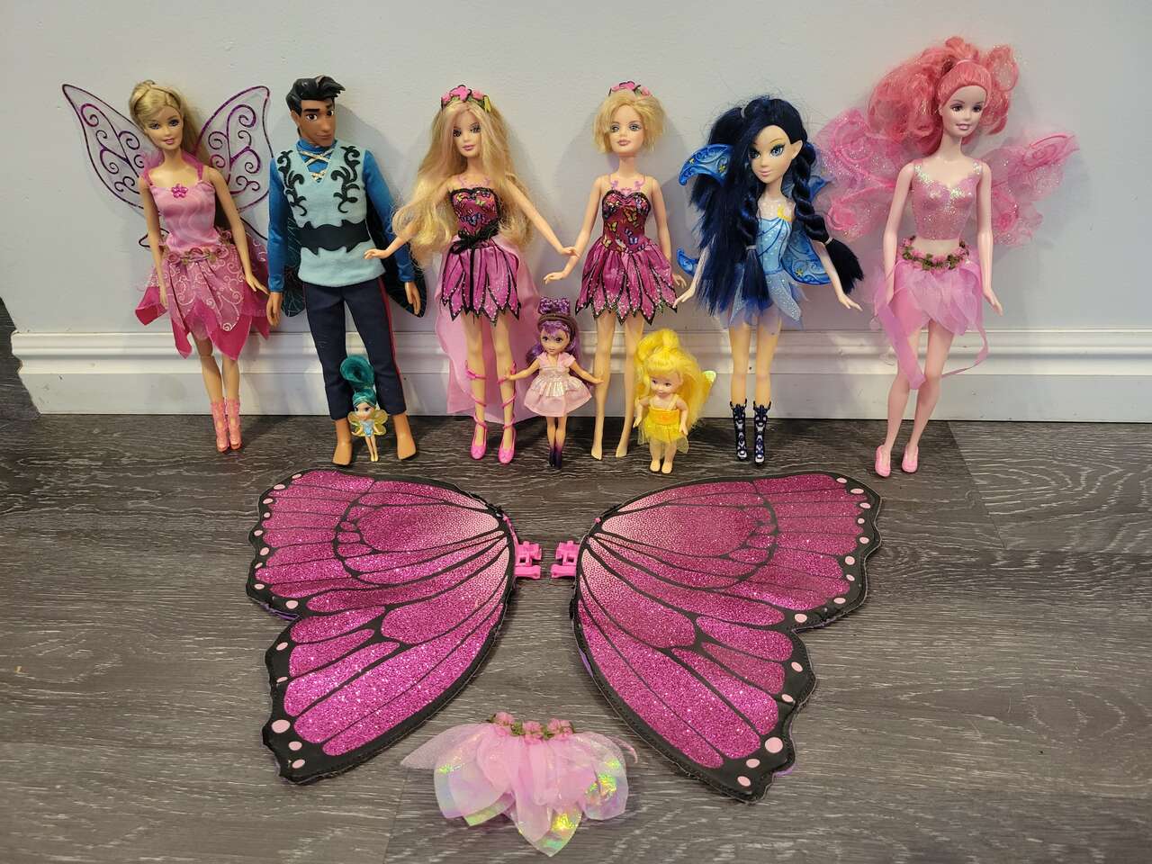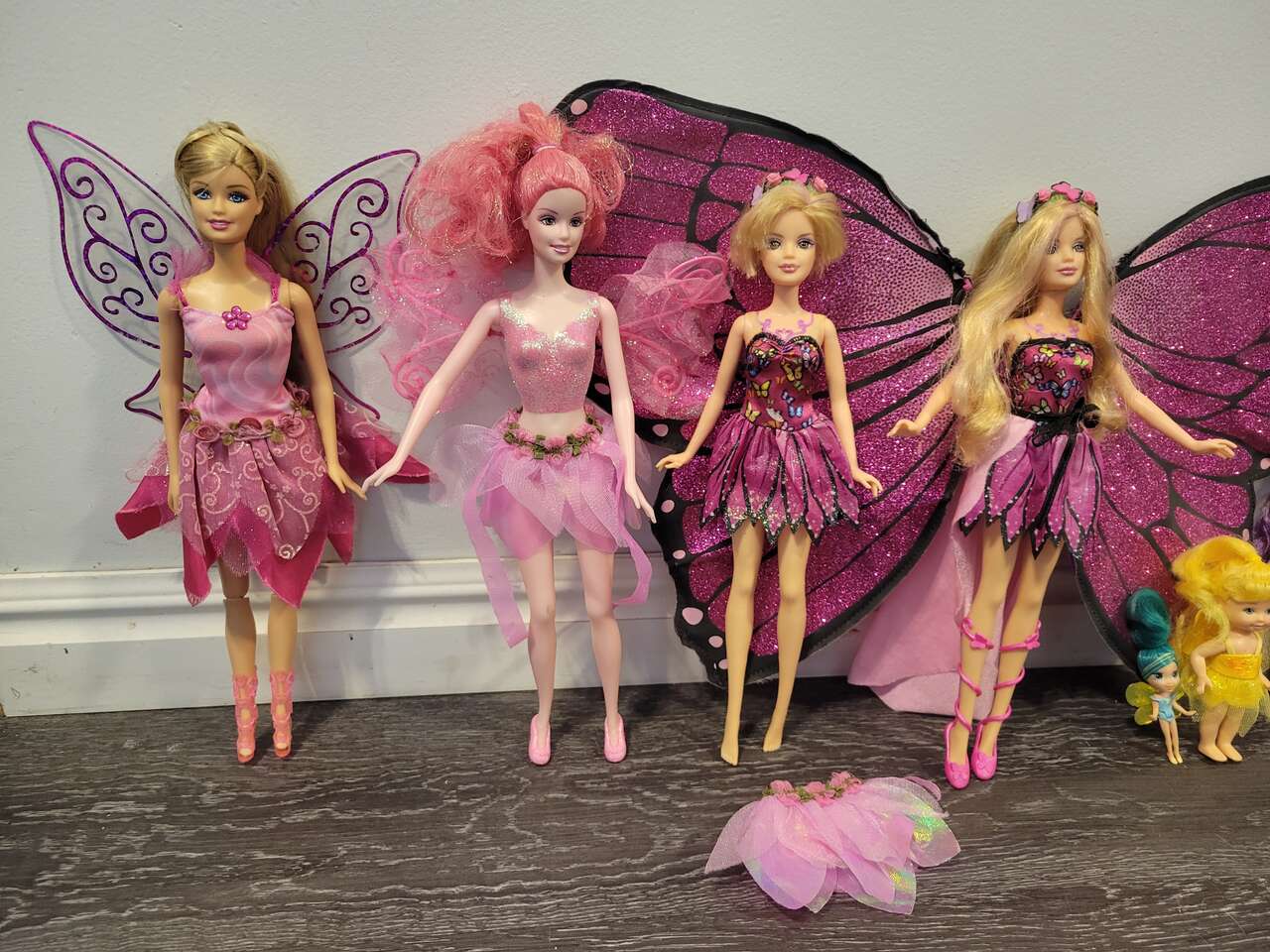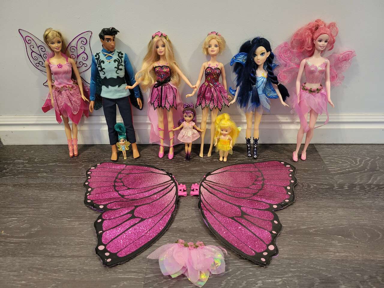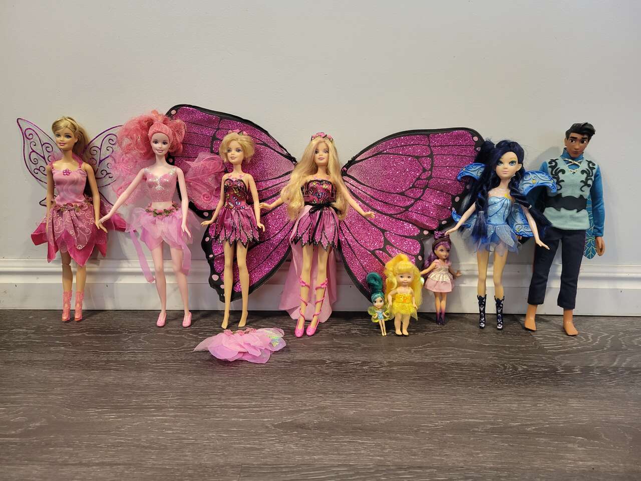 Barbie 2 magic wings mariposa butterfly doll's, and a couple fairytopia pink fairy doll's... magic of the rainbow lumina and others included, with a skirt