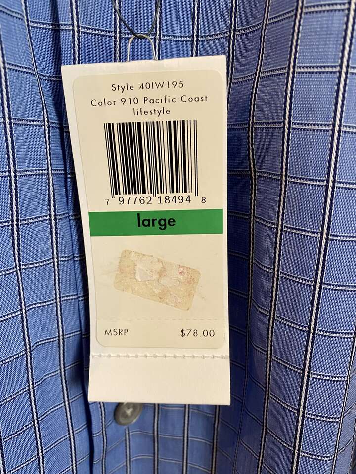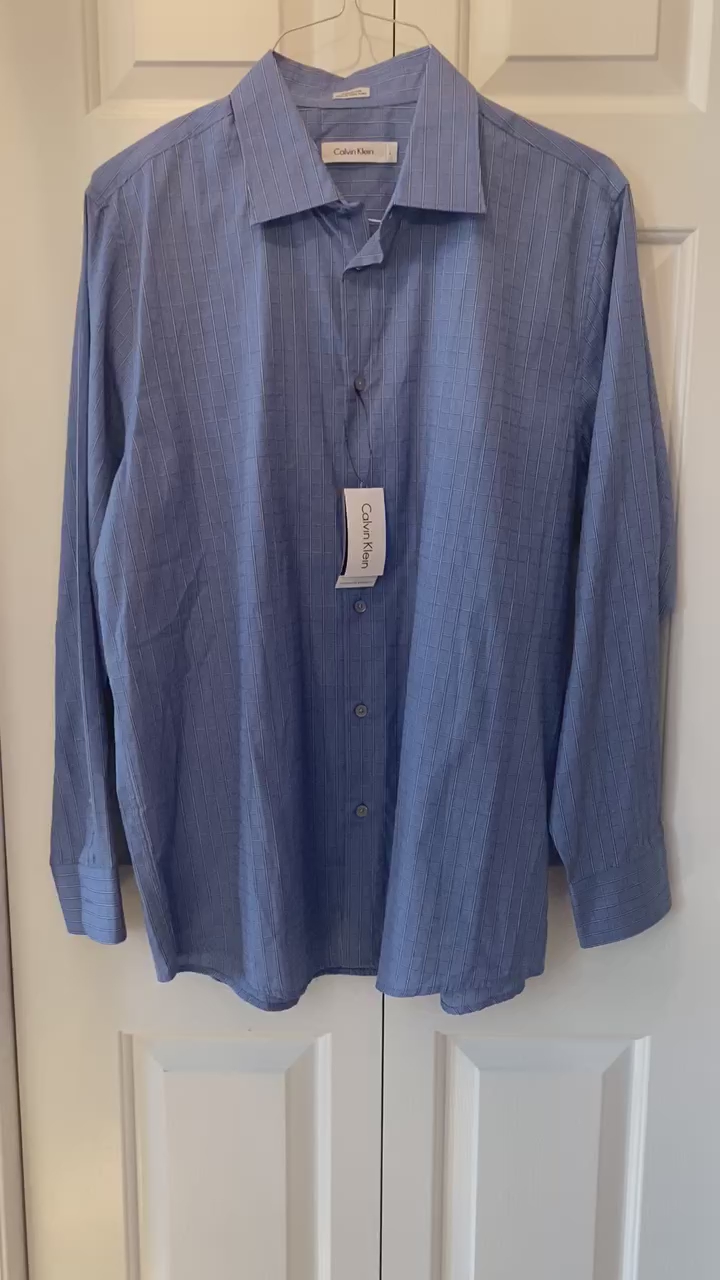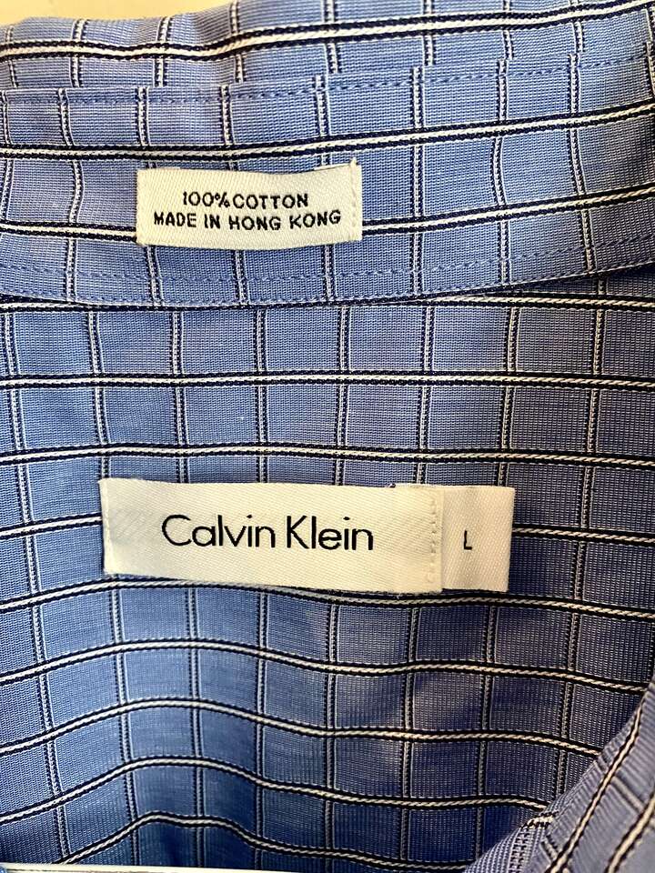 NEW - Classic Calvin Klein Lt Blue w/ Black and White Accent Checks - Mens SZ L Button Down Dress Shirt -C PICS. This Stunning Shirt retails for $78+. The light spots on the shirt and bench are only a reflection from the nearby cut glass window. I am listing many Nice Mens shirts so check them out as well.