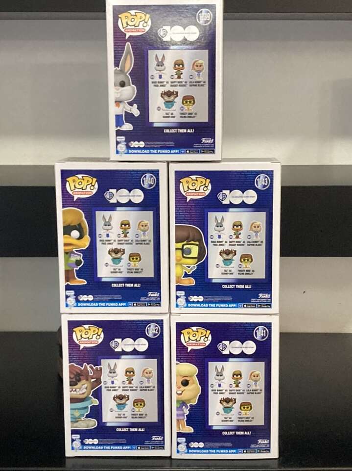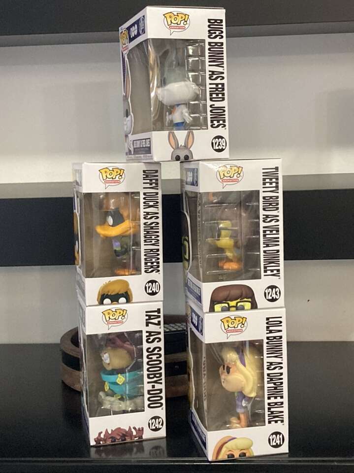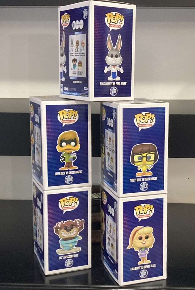 Looney Tunes as Scooby Doo characters Funko Pop set. This is the full set of this series, set includes-Bugs Bunny as Fred, Daffy Duck as Shaggy, Lola Bunny as Daphne, Taz as Scooby and Tweety as Velma. All are brand new in the box and boxes are in great condition.