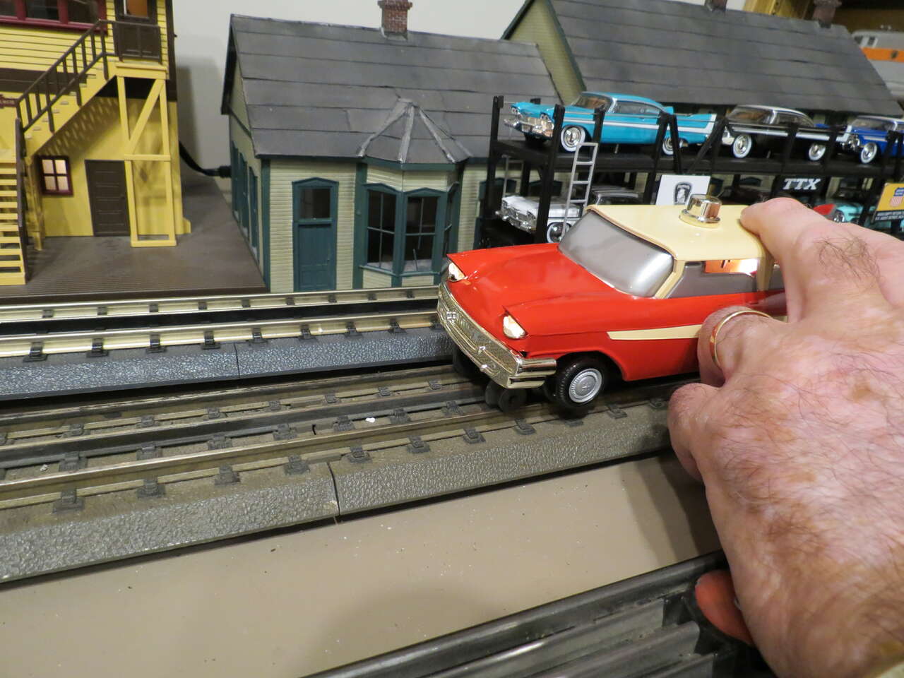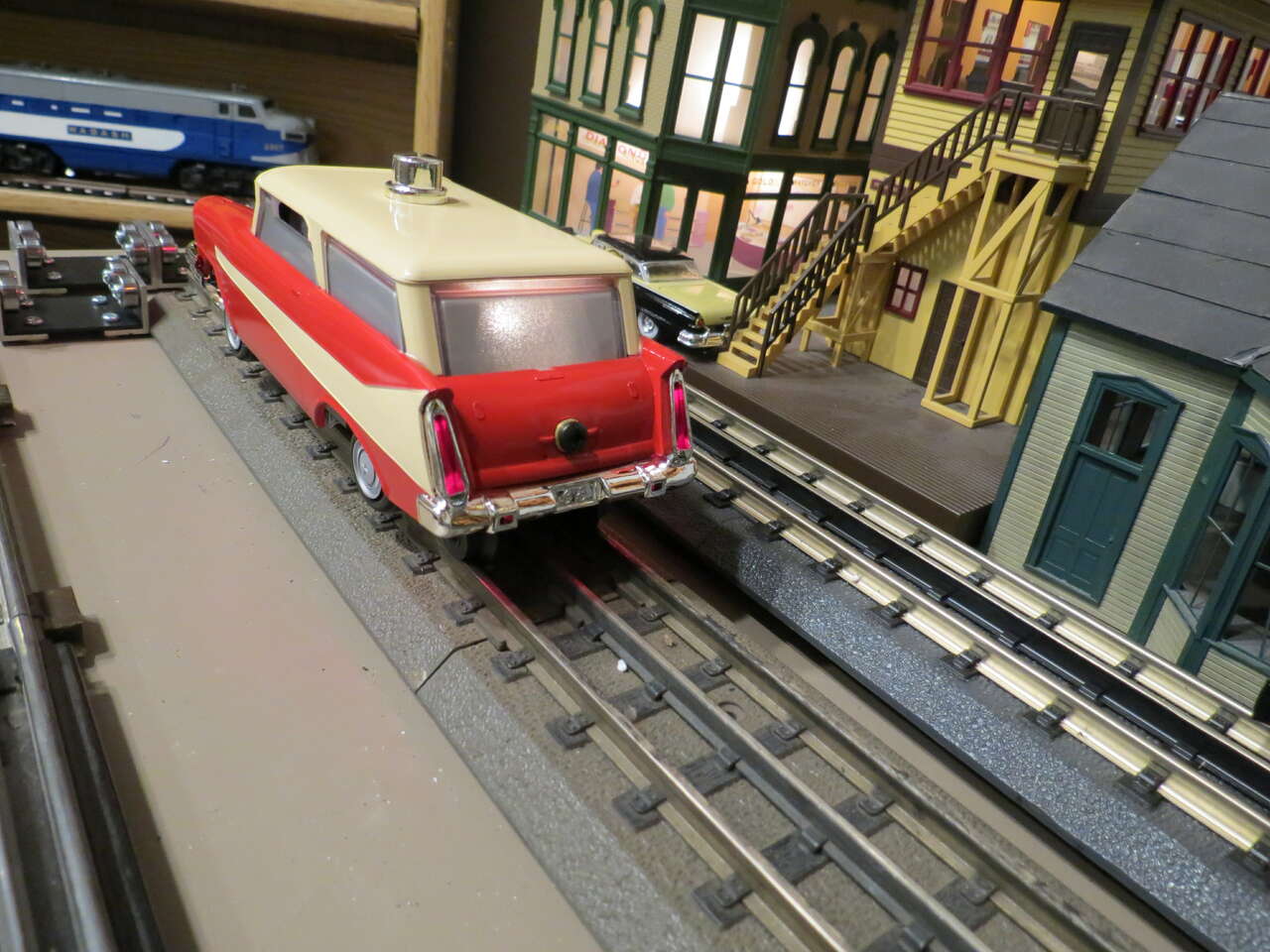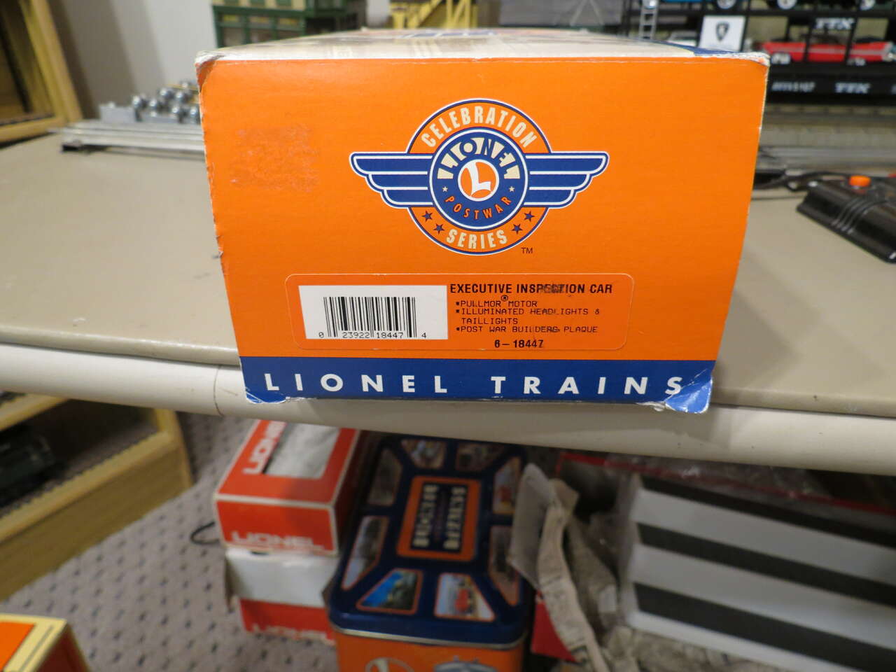 Lionel Lines Executive Inspection car. This is the modern recreation of the #68 that came out in Postwar 1950's. I bought 2, keeping one. It has superior fit, paint finish and pullmor motor when compared to the Postwar 1950's version. It is mint unrun and hard to find if at all.. The background items arer not included in this sale.