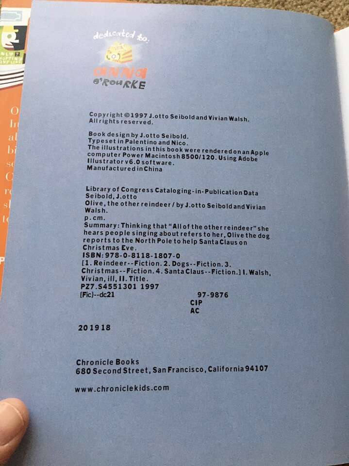 Olive, the Other Reindeer, by J. Otto Seibold, illustrated by Vivian Walsh. The beloved 1997 Christmas book, hardcover in excellent condition, including dust jacket. Text only. Cash or Venmo.