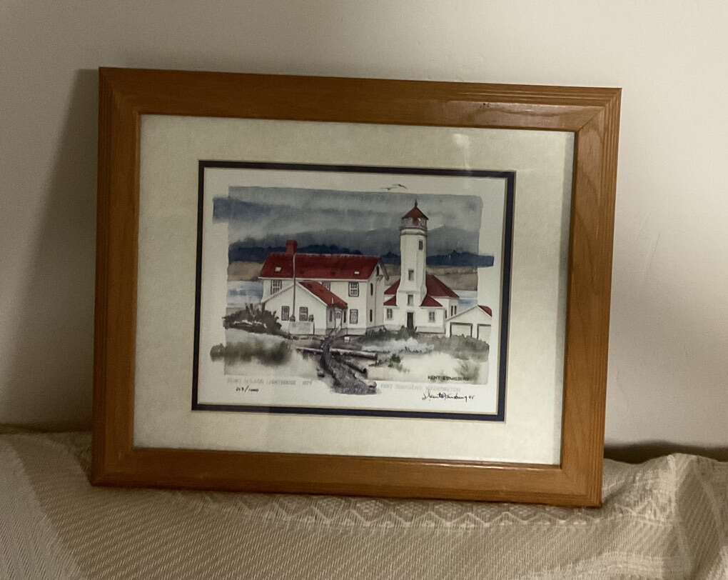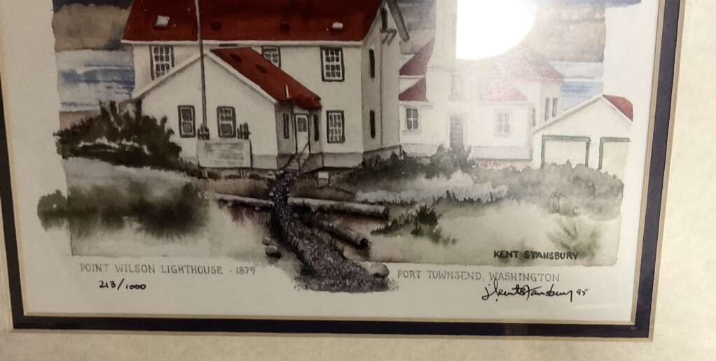 Point Wilson Lighthouse Watercolor 1879 print signed and number 213 / 1000 by Kent Stansbury. It is near point Townsend Washington 16” lengthwise x 13.5” top to bottom Beautifully framed and matted