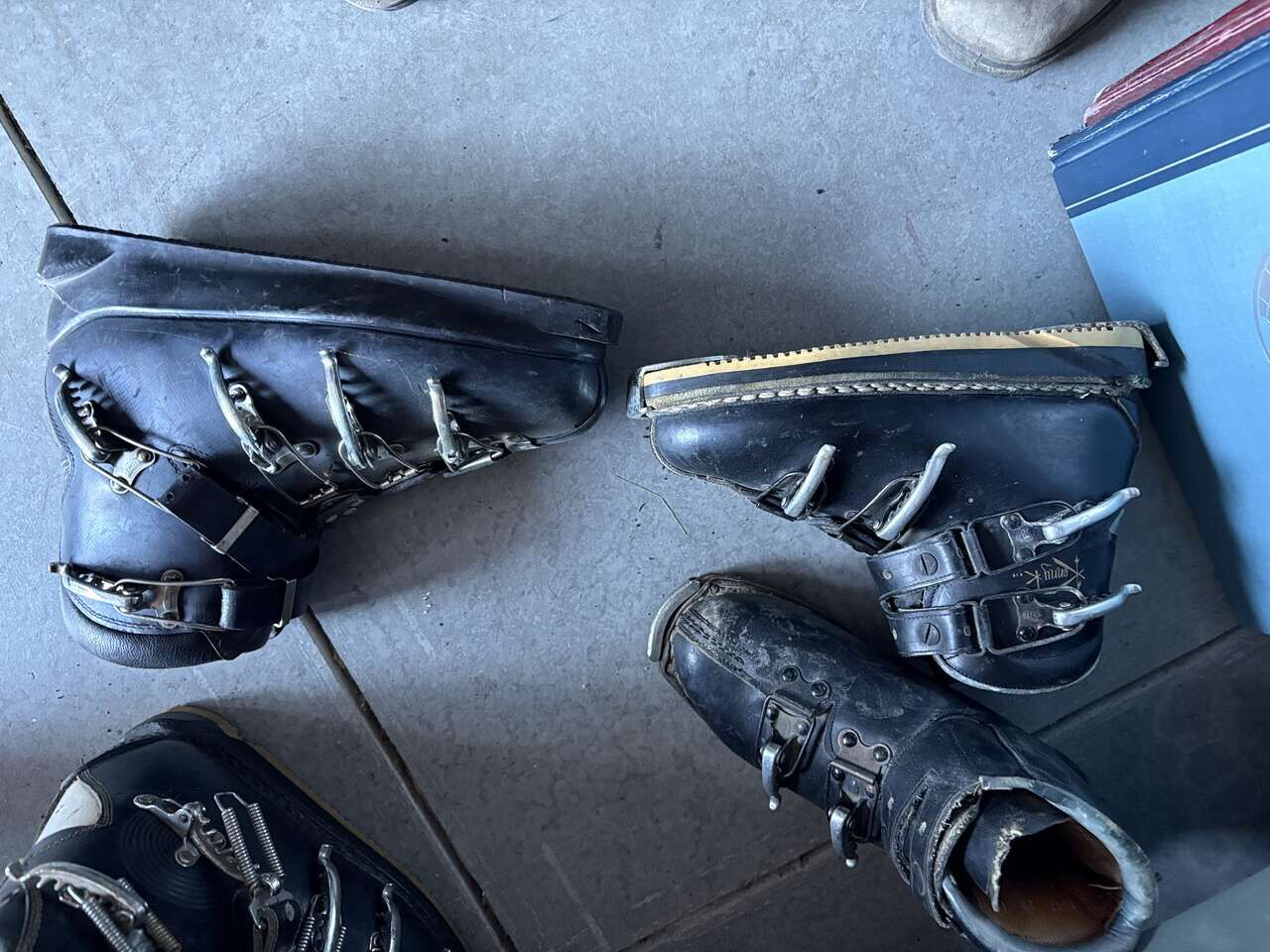 these leather ski boots are the perfect decoartion for you cabin or home. They make good book ends too. $50 per pair. The pair that includes metal bootbholder is $90 for the combo