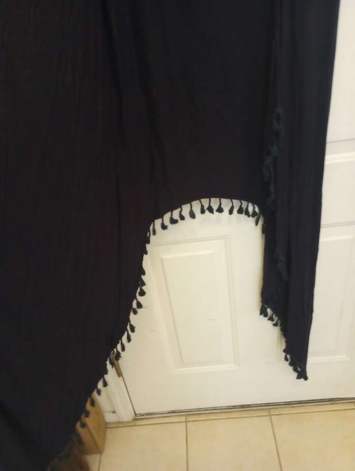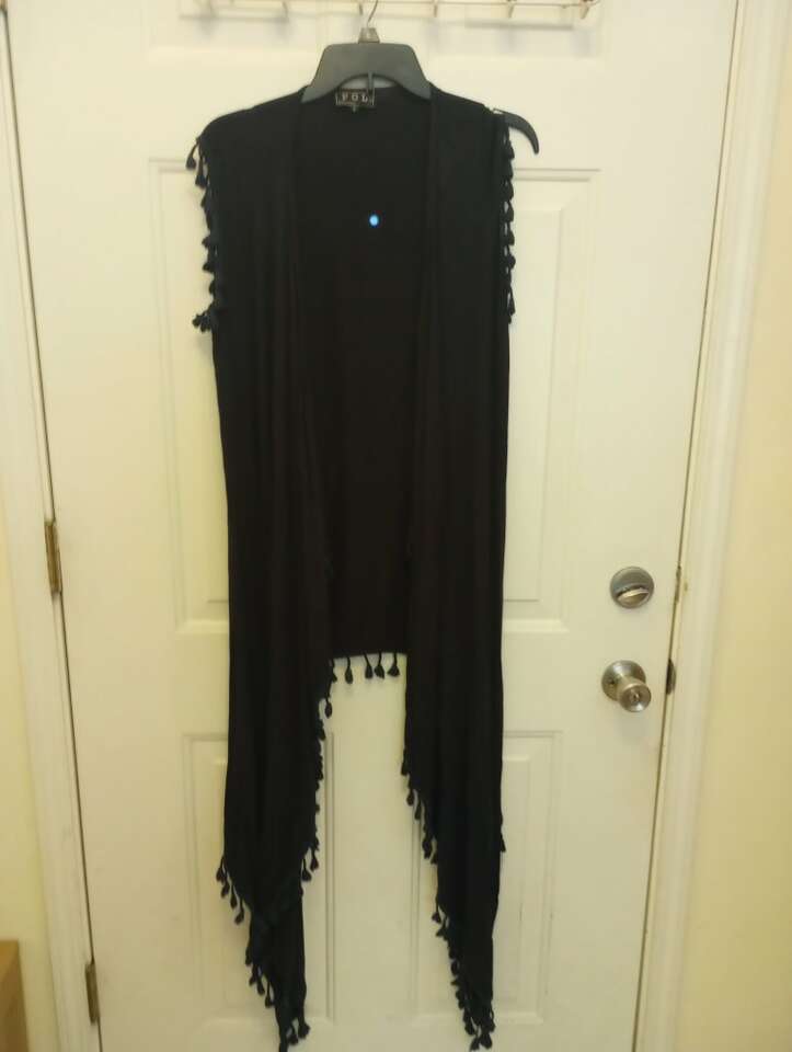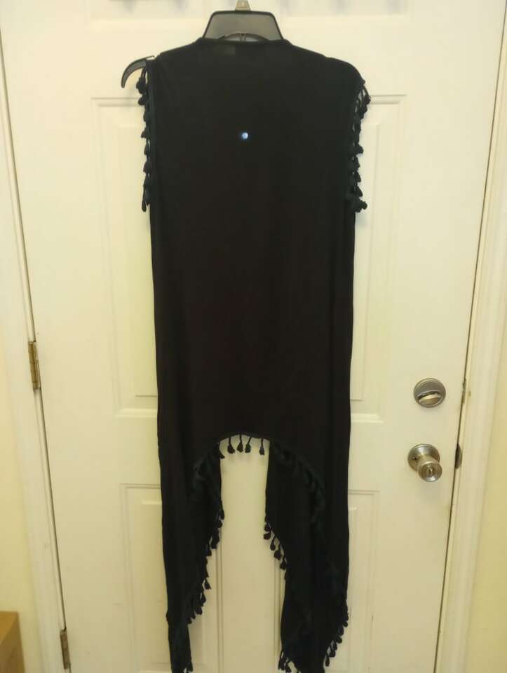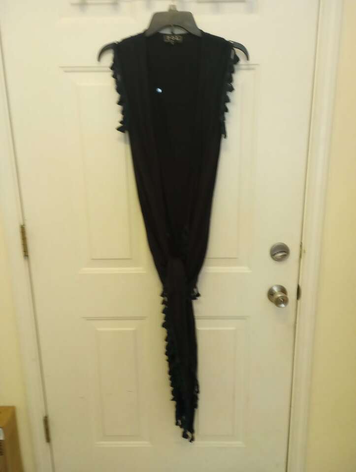 Used, and women's navy blue shawl type top with tassels...tag says size small but because of the style of this I would say it can fit a Medium as well. Feel free to try on before you buy. To be worn over another top and can be worn straight down or tied. Play around with it. From a pet and smoke-free home. $12 cash or Venmo. Will hold with Venmo. Check out my other ads~lots of women's clothing and other items for sale.