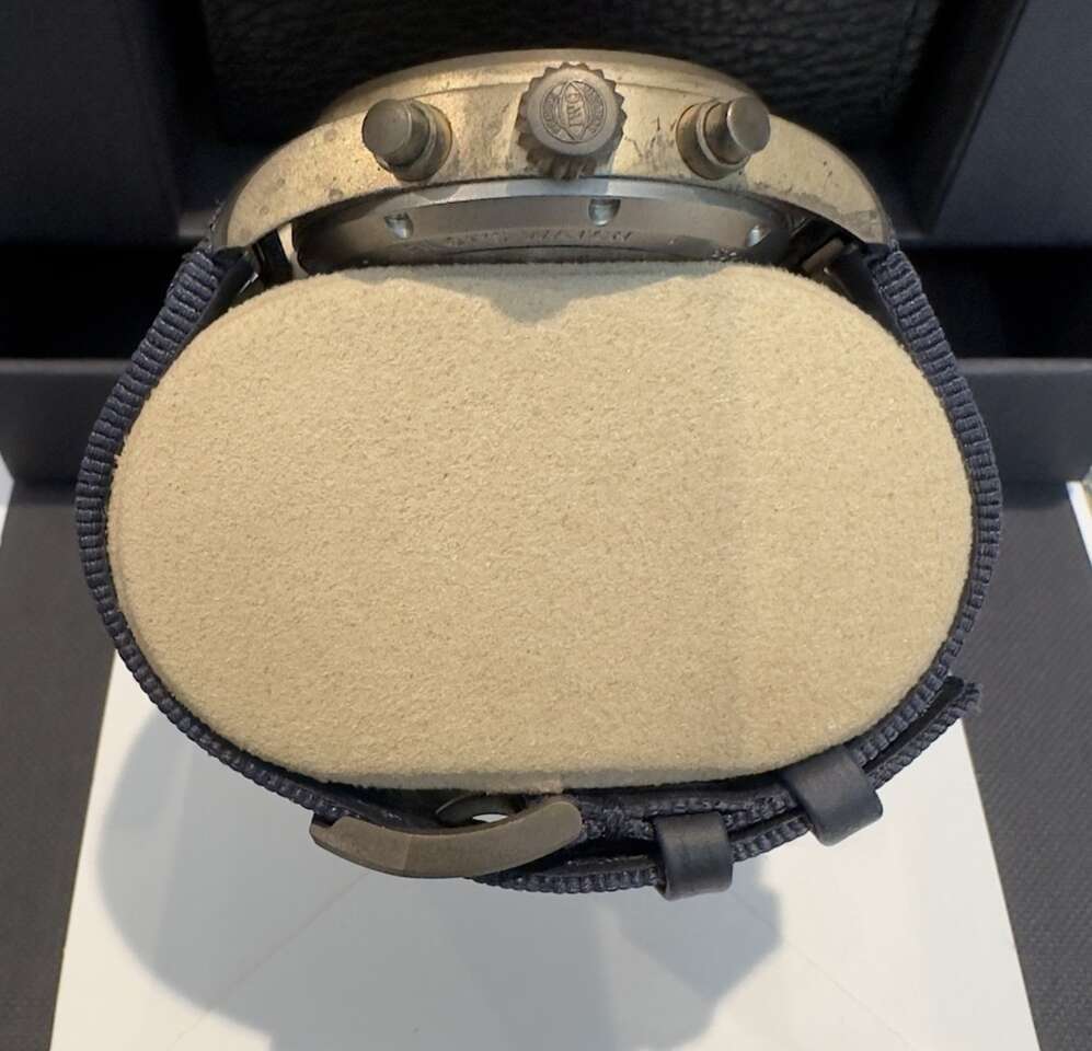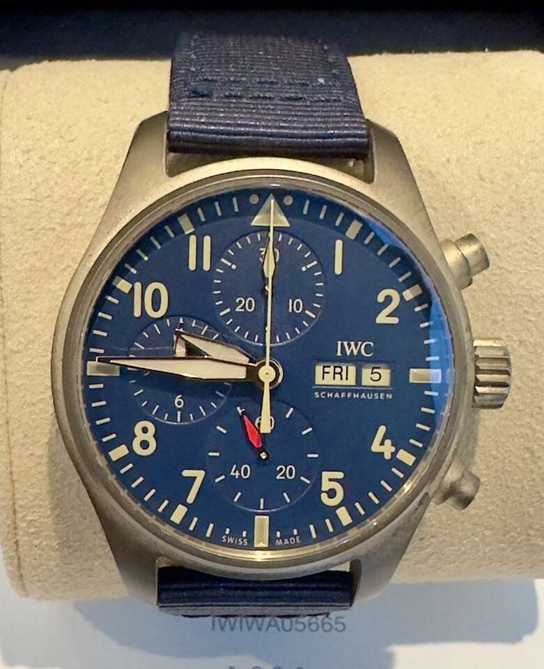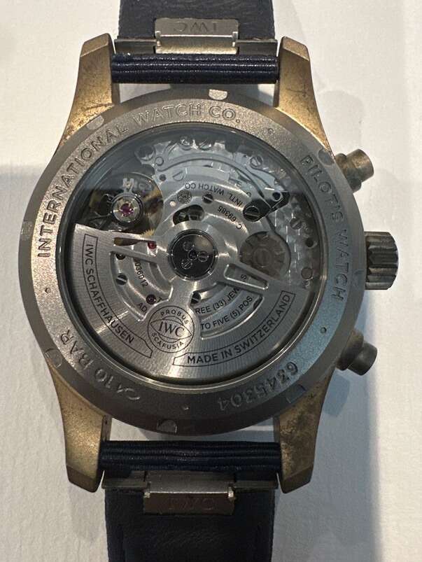 PayPalPilot’s Watch chronograph bronze in blue is in a 41m case size with the IWC-manufactured 69385 calibre and a sapphire glass back.