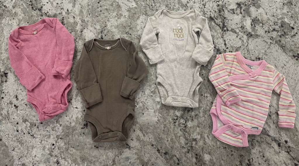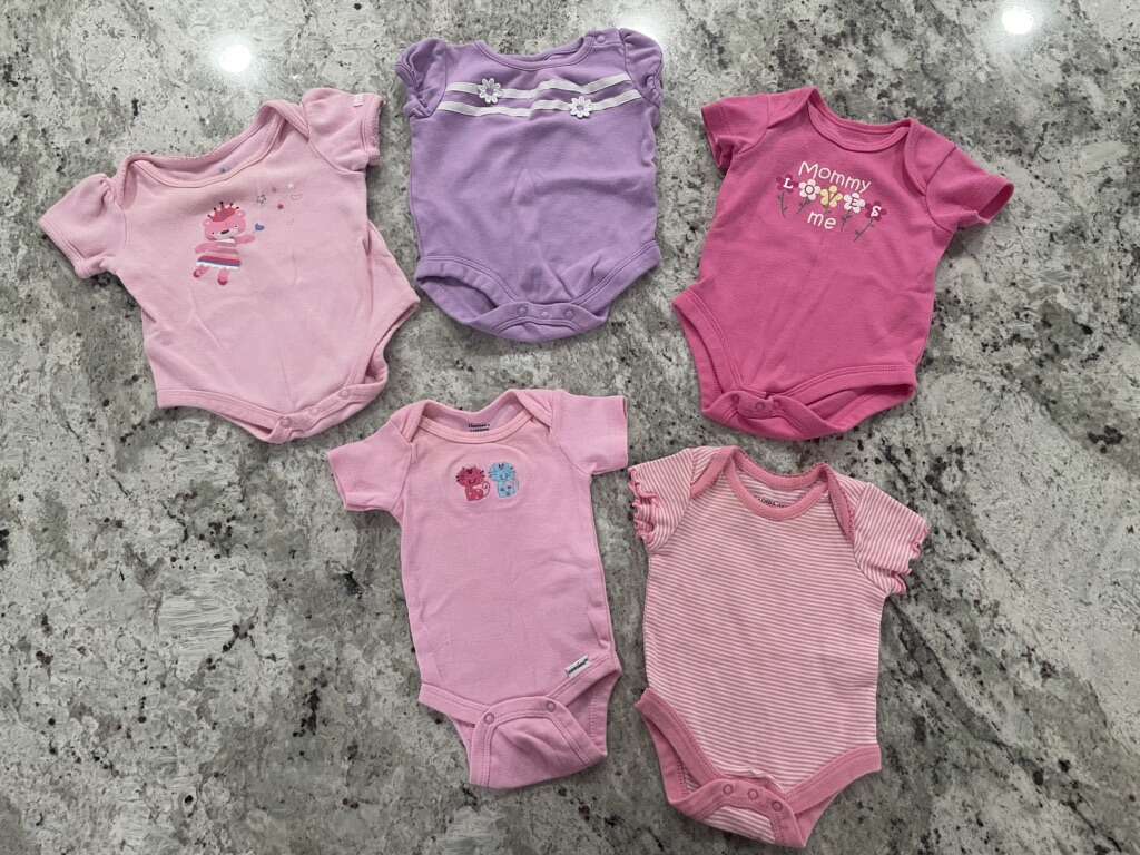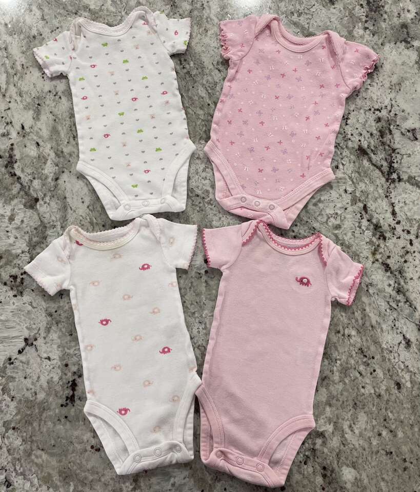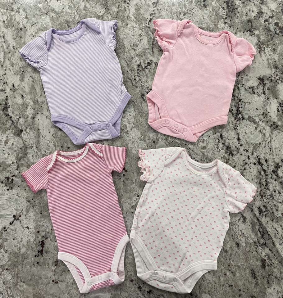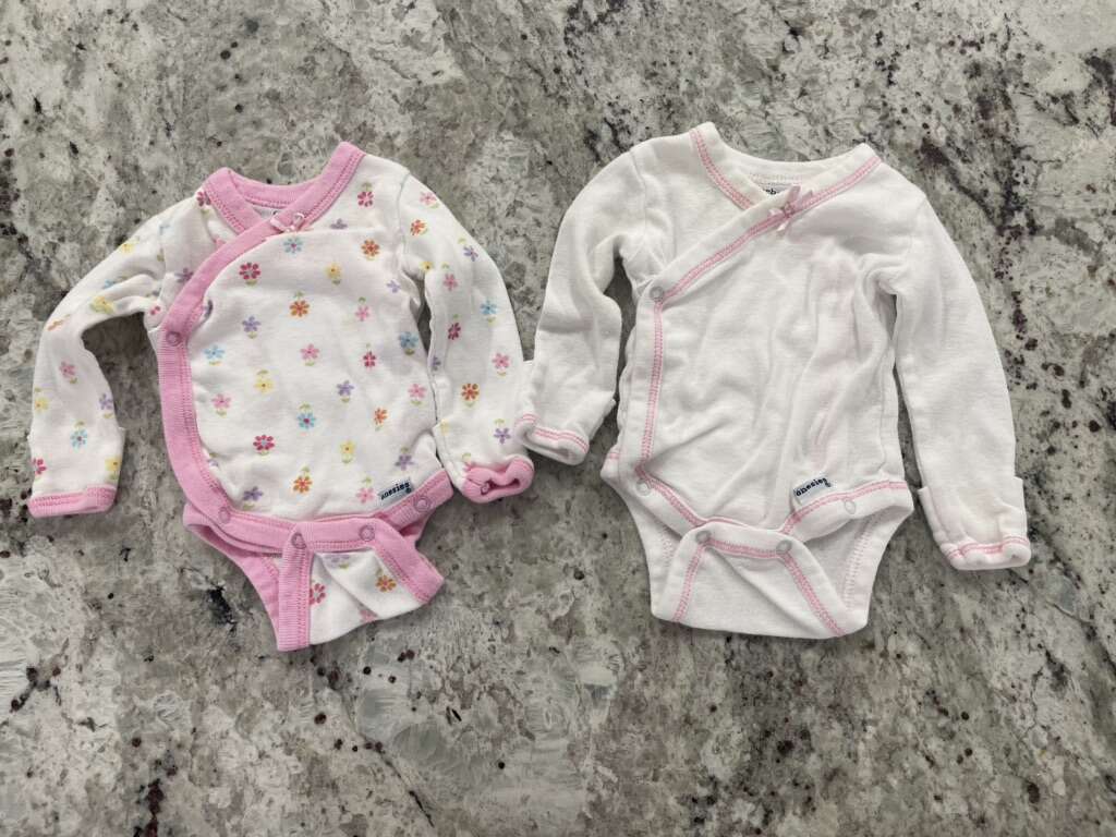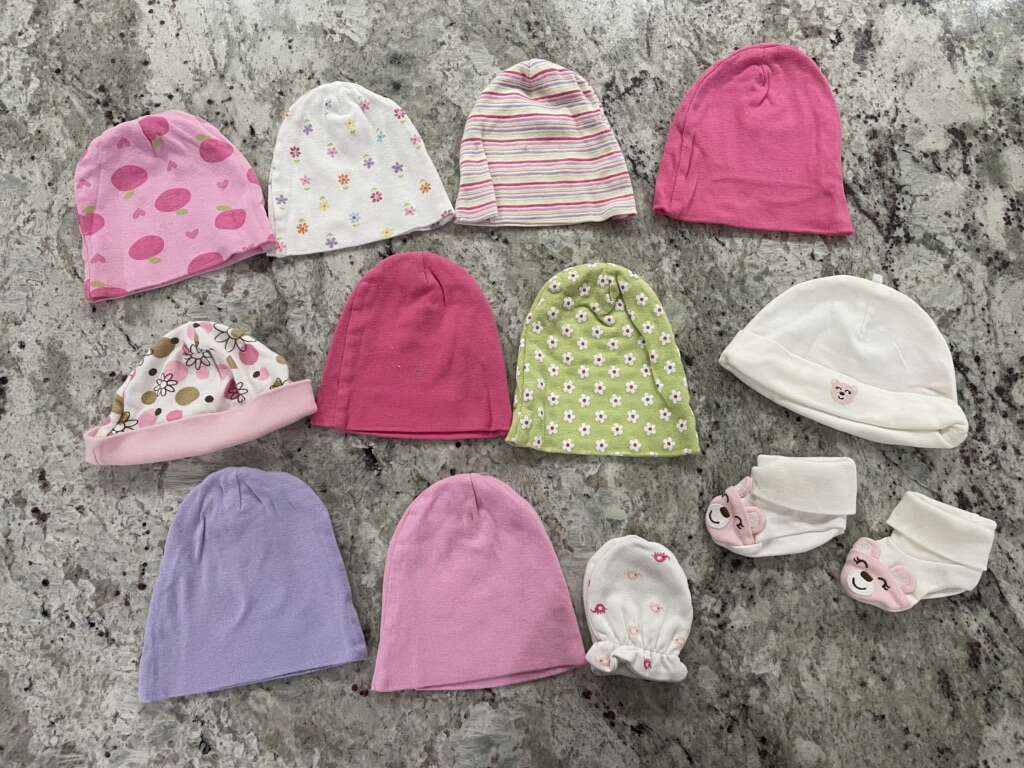VenmoMonkey hat 3 pair shoes 7 pair socks 5 long sleeve footed pjs 2 outfits 4 dresses 8 long sleeve onesies that fold over hands 2 long sleeve onesies 9 short sleeve onesies 4 pants 1 jacket 1 pair no scratching mittens 1 pair booties 10 hats 2 long sleeve sleeping sack 3 swaddle wraps 13 short sleeve onesies 3 long sleeve onesies 1 Car seat head support
