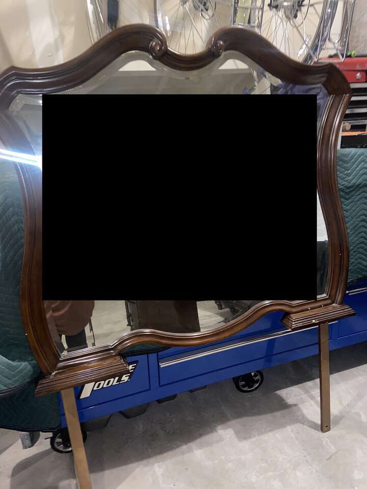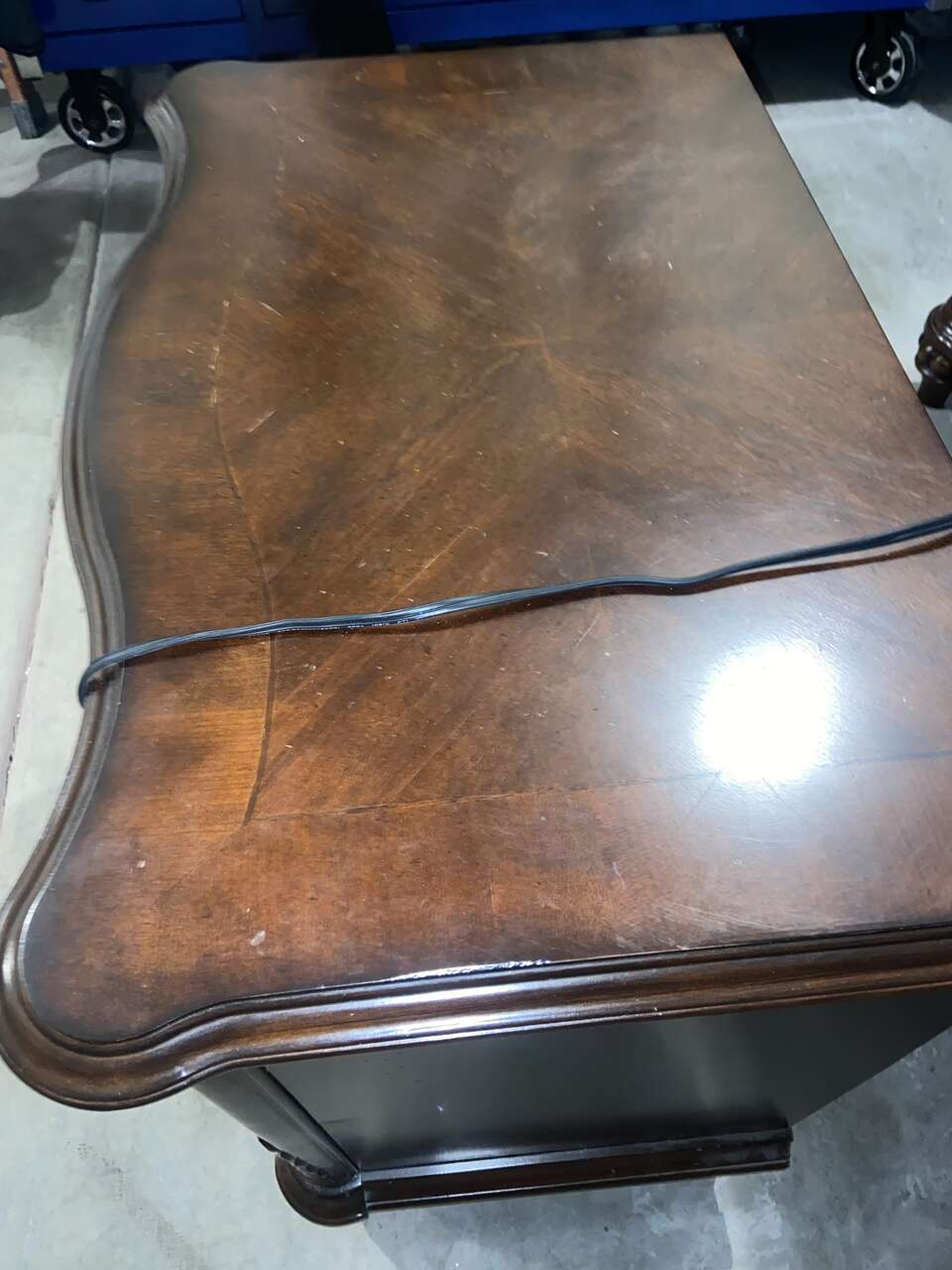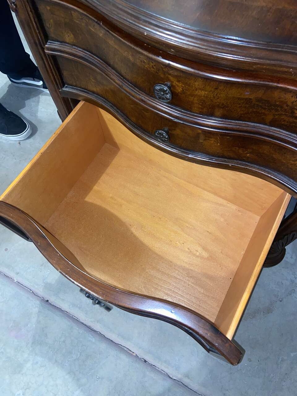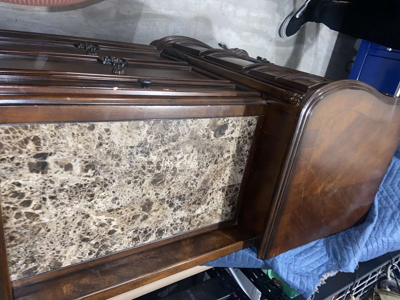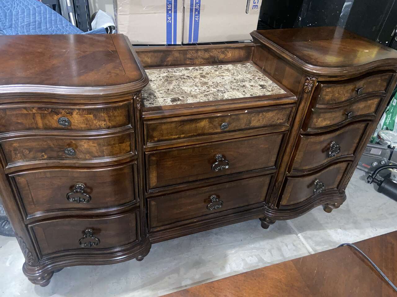 Fairmont Designs Dresser and mirror- 9 drawer. This is a split level dresser with marble in the center. The drawers are deep and slide smoothly. The drawer fronts are burled with banded borders. This is a heavy, well made dresser that's in really good shape.