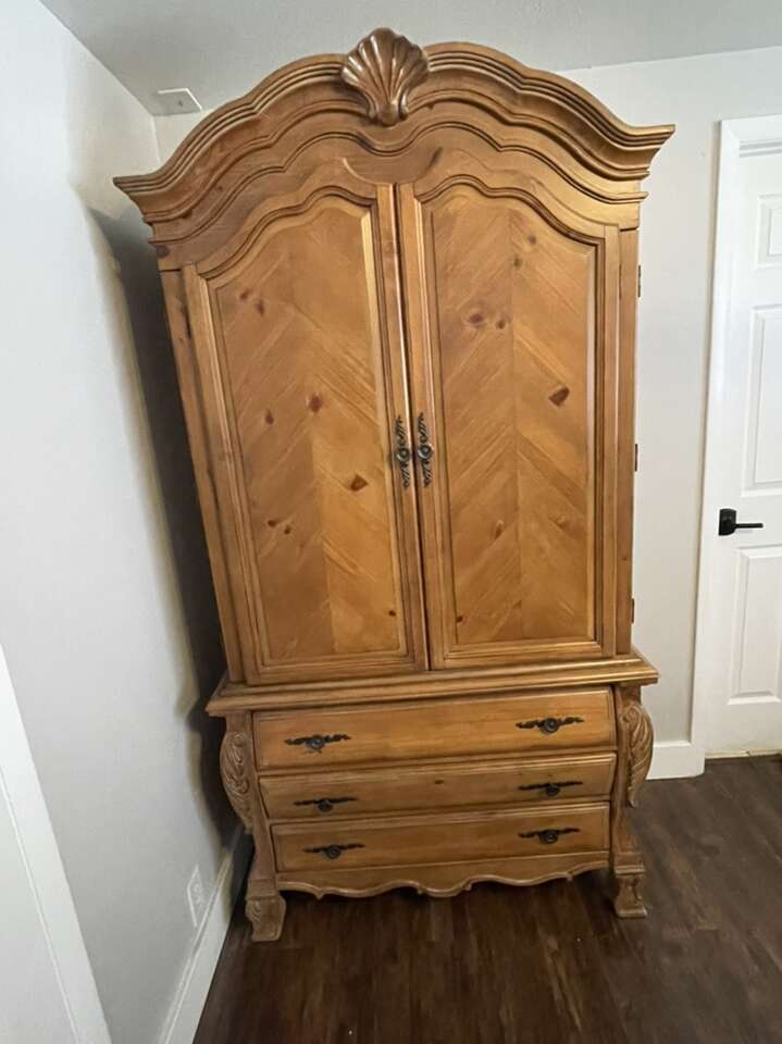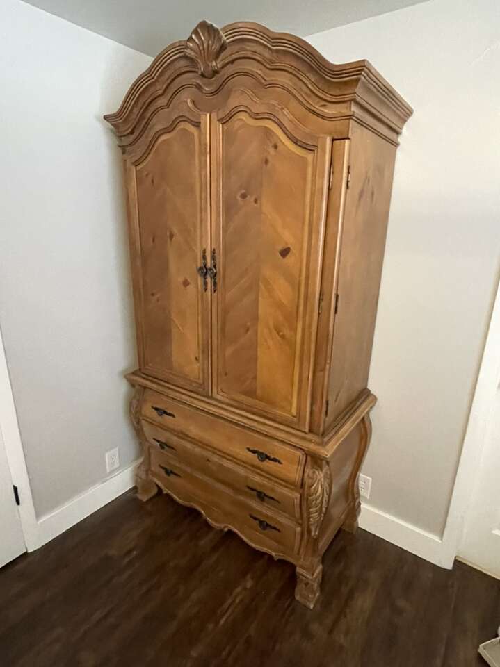 Armoire for sale. It is in great condition. The top part comes off for easier transport. Has three drawers on bottom and the top has dividers on bottom and a shelf in the middle. This is part of my bedroom set but no longer need it and so were selling it. It measures 85” tall by 44 1/2” wide by 22 1/2” deep. The brand is Fairmont Designs. Asking $450 for it. Cash only. Call or text preferred.