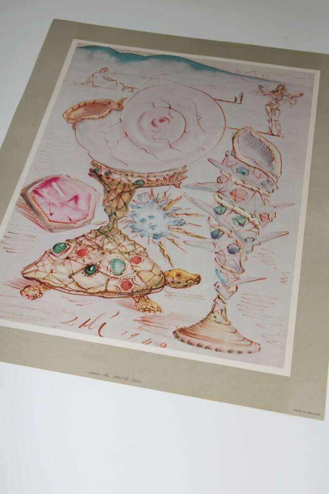 Dali Nature “Turtle and Jewels” Watercolor Lithograph Print A rare period vintage full-color print of Surrealist painting "Turtle and Jewels" by Salvador Dali from a First Edition art folio of The Albert D. Lasker Collection. Printed in Switzerland in the 1950s, probably by Albert Skira. Printed on one side. Signed in the print. First Limited and only edition. Copyrighted in NY, USA. Superb quality and excellent condition - no damage, minor edge wear. Never framed. Holland, 1952.
