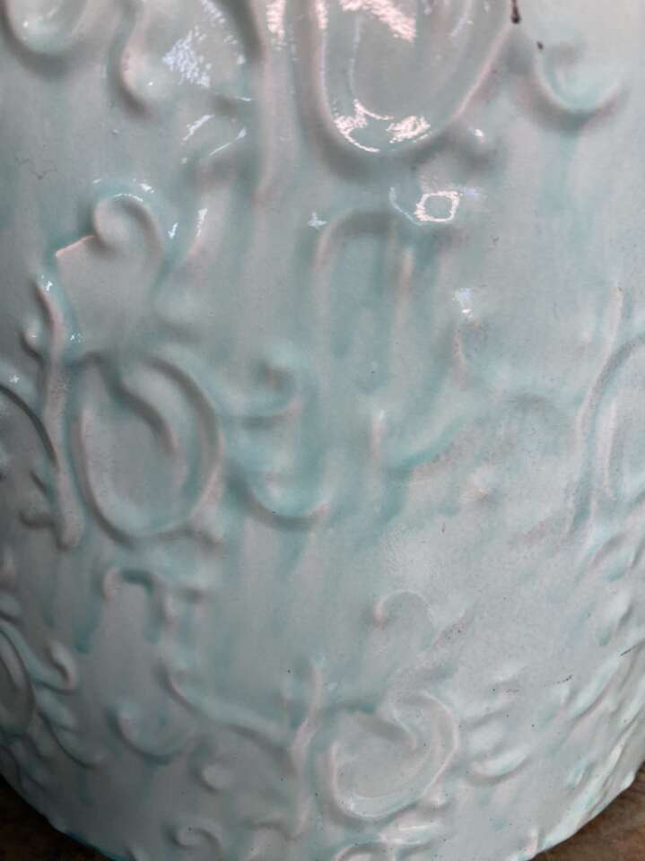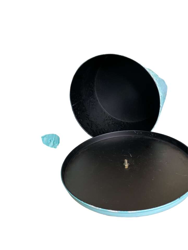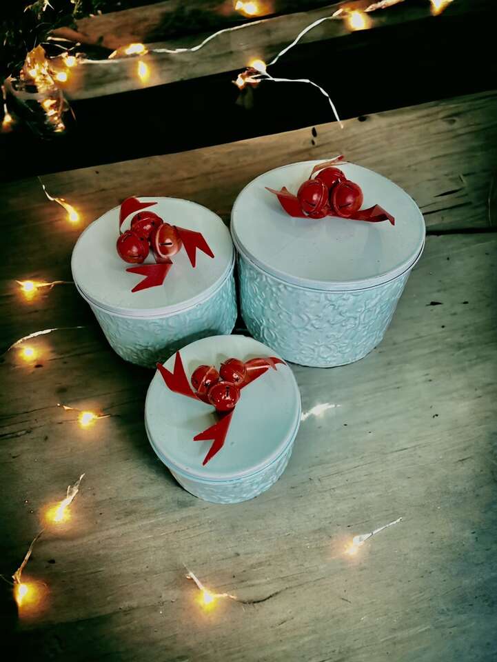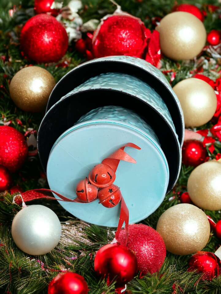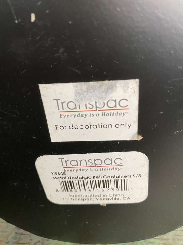 3 Piece Metal Christmas Nostalgic Bell Containers sea glass green. The metal has a raised texture has a gradient with lighter and darker sea glass green. 6 3/8tall 8 3/8” wide is the largest one the fit inside each other. Red bells on top super cute retail $90.00. They are metal wrapped in a embossed metal