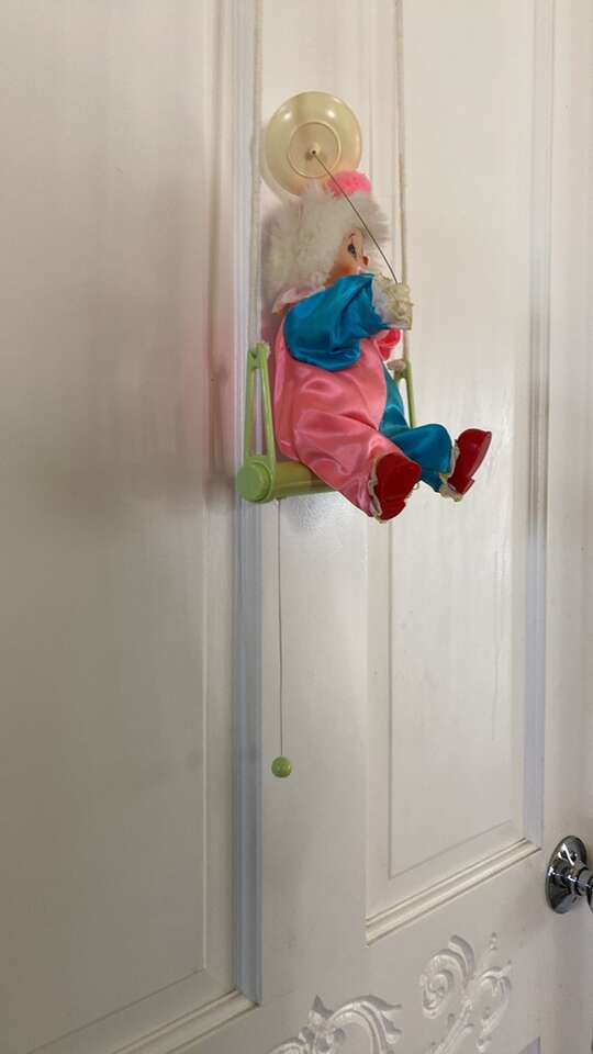 vintage Iwaya baby clown whistles and swings hanging. Made in Japan hangs 16 long. Clown is 9” sitting on swing . Takes 2 AA battery Hangs in nursery over crib or anywhere you like clowns. He blows a whistle that's in his mouth